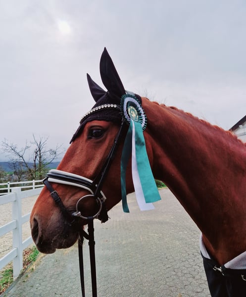 Ich suche für meine Hübsche und verschmuste 6- jährige, ca. 1.70m große Fuchs Stute ein neues Zuhause. Baronesse de Kefferberg ist eine Tochter des Bernay aus einer For Romance I Mutter. Ich habe sie als 3 jährige gekauft und selbst Ausgebildet, Aktuell kann sie Siege und Platzierungen in der Klasse A und Platzierungen in der Klasse L vorweisen, auf Turnier ist sie stets ruhig, ausgeglichen und ohne Problem allein händelbar. 2023 SLP geprüft. Von Kindern und Jugendlichen gut zu reiten. Kann mir Baronesse auch gut in einer Mutter/Kind kombi vorstellen. Ausritte in den Weinbergen oder am Strand sind kein Problem. Im Umgang freundlich, klar im Kopf und unkompliziert – eine zuverlässige Partnerin mit Zukunftsperspektive! Baronesse ist Schmied und verladefromm. Mit anderen Pferden Sehr verträglich. Sogar im Freispringen zeigte sie versteckte Talente. Bei Fragen können Sie sich gerne jederzeit telefonisch melden. Standort 53501 Grafschaft 015776130336