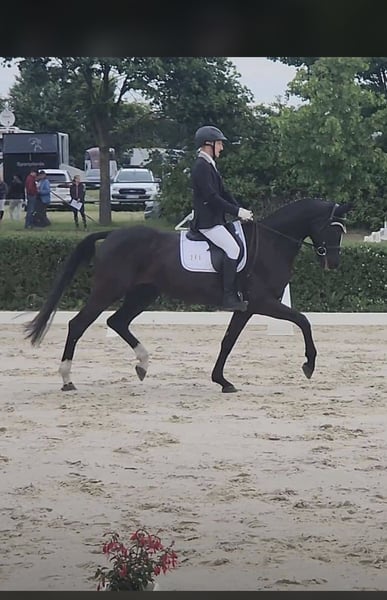 Here is a beautiful mare for sale. The mare was born in 2019. She stands approximately 1.70 m tall, is a dark bay (rappho), and has three very good basic gaits. Pedigree: Sire: Decurio Desperados Grandsire: Fürst Wettin Fürst Heinrich In 2023, she foaled a foal. In 2024, she was gently backed and started under saddle. In 2025, she participated in six competitions, placing three times in A-level classes. Due to her young age and still limited experience, she is not suitable for beginners. The mare is healthy, shoe- and loading-safe. A veterinary examination (TÜV) is not available but can be arranged upon purchase. This is a private sale.