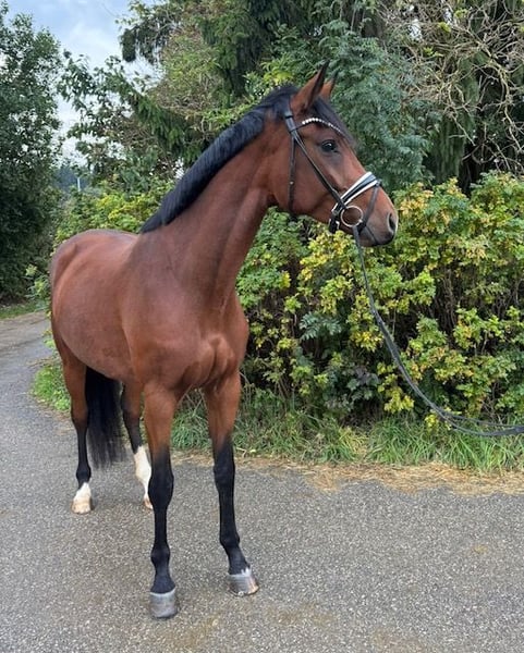 Diese großrahmige, elegante 6-jährige Stute überzeugt durch ihre moderne Aufmachung, sehr gute Abstammung und ihre feine Rittigkeit. Mit einem Stockmaß von 178 cm bringt sie viel Präsenz und Ausdruck mit. Aktuell befindet sie sich auf solidem Dressur-A-Niveau und zeigt sich lernwillig sowie motiviert bei der täglichen Arbeit. Ihre drei Grundgangarten sind taktsicher und gut ausbalanciert, mit besonderer Qualität im Trab und einer bergauf angelegten Galoppade. Erste Lektionen der Klasse L werden sicher und zuverlässig abgefragt. In der Springstunde und im Gelände zeigt sie sich immer motiviert und kopfklar. Sie hat einen lieben Charakter und liebt es die Aufmerksamkeit Ihres Menschen zu haben. Beim Schmied ist sie artig, in den Anhänger steigt sie brav ein. Sie ist vorne beschlagen, regelm. entwurmt und turniermässig gegen Herpes, Influenza und Tetanus geimpft. Sie lebt bei uns in einer Stutenherde mit täglich 8-15 h Paddock oder Weide. Nachts hat sie Ihre eigene Box. Wir wünschen uns für sie natürlich ein 10*-Zuhause, mit artgerechter Haltung, genügend Auslauf und einem Menschen, der ihr Herz im Sturm erobert. Eine interessante Nachwuchsstute für ambitionierte Reiter, die Wert auf Qualität, Abstammung und Rittigkeit legen. Für ein Kennenlernen mit Probereiten wird ein Gebühr in Höhe von 25 Euro in bar sofort fällig.