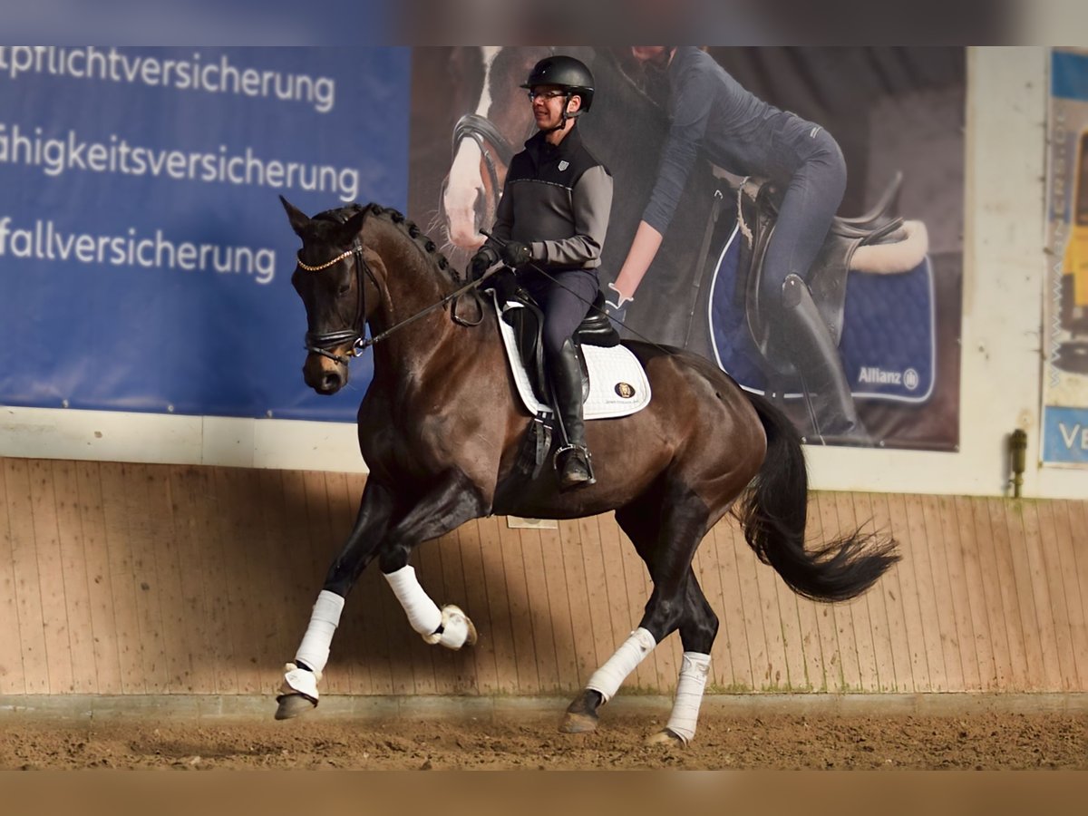 Zum Verkauf steht eine großgewachsene Stute in dunkler Jacke mit drei sehr guten Grundgangarten. Hervorzuheben sind hier der sehr gute Schritt und Galopp. Sie bring eine hohe Rittigkeit mit und lässt sich in allen Gangarten gut sitzen. In Dressupferdeprüfungen der Klasse A konnte sie sich bereits platzieren. Derzeit wird sie auf Starts in der Klasse L vorbereitet. Zudem hat sie eine sehr gute Stutenleistungsprüfung abgelegt. Sie gehört mütterlicherseits zur renommierten Neustädter P-Familie, welcher viele erfolgreiche Sportpferde und auch gekörte Hengste entspringen. Zu ihren Brüdern gehört der gekörte Hengst Benedetto Ragazzo, der sporterfolgreich bis zum Grand Prix ist und sich mittlerweile in japanischem Besitz befindet. Ein weiterer Bruder ist der ebenfalls gekörte Bon Muscadet, welcher zur Hengstkollektion der Neustädter Gestüte gehört und sich derzeit in sportlicher Förderung befindet. Großmutter Prime Time brachte die gekörten und sporterfolgreichen Hengste Don Royal, Bloomingdale und Don Henley. Vater Don Martillo war Weltmeister der jungen Dressurpferde, sowie Bundeschampion und kann mittlerweile etliche gekörte Hengste, Prämienstuten, Sportpferde und Auktionspferde nachweisen. Ein aktueller Tüv inclusive Rücken und Hals liegt vor.