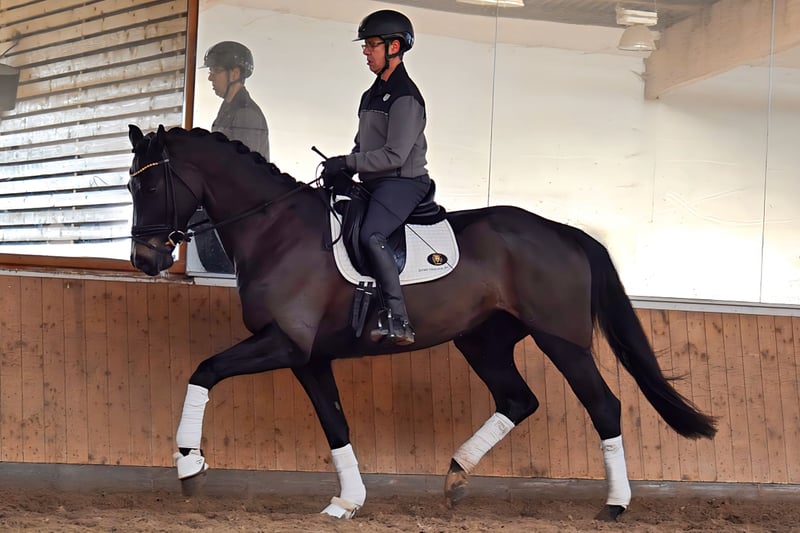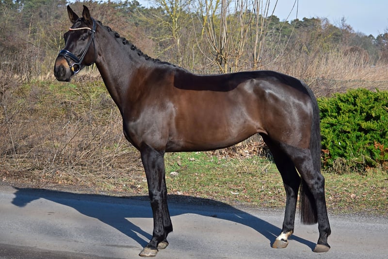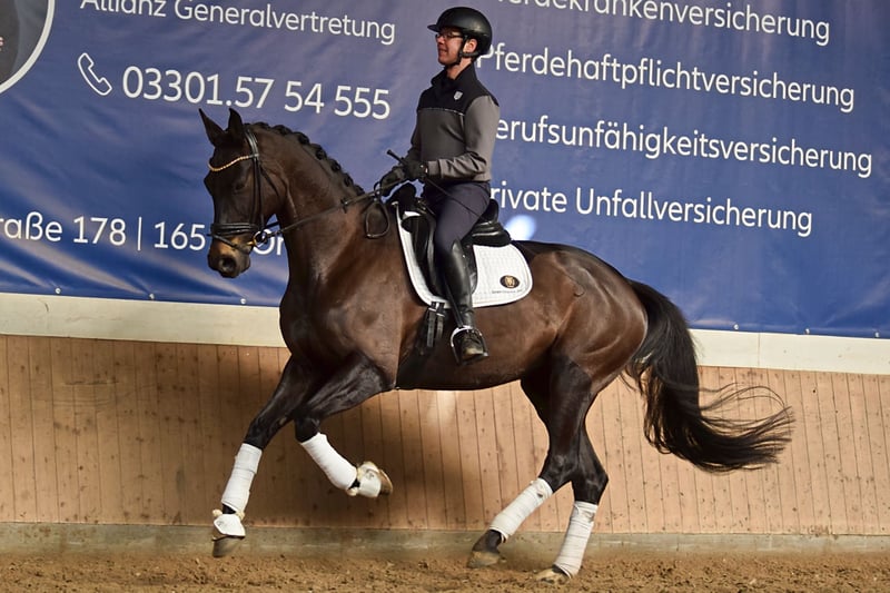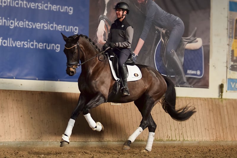 Se ofrece a la venta una yegua de gran tamaño, con un pelaje oscuro y tres pasos básicos muy buenos. Destacan especialmente su trotón y galope, que son de excelente calidad. Tiene una alta manejabilidad y se deja montar con facilidad en todos los aires. En concursos de doma de nivel A, ya ha logrado colocaciones. Actualmente, se está preparando para participar en pruebas de nivel L. Además, ha obtenido una excelente prueba de rendimiento para yeguas. Por parte materna, pertenece a la prestigiosa familia P de Neustadt, de la cual han surgido numerosos caballos de deporte exitosos y caballos de cría aprobados. Entre sus hermanos se encuentra el semental aprobado Benedetto Ragazzo, que ha tenido éxito en la competición hasta el nivel Grand Prix y actualmente se encuentra en propiedad japonesa. Otro hermano es el también aprobado Bon Muscadet, que forma parte de la colección de sementales de Neustadt y actualmente está en desarrollo deportivo. Su padre, Don Martillo, fue campeón mundial de caballos jóvenes de doma y cuenta con numerosos descendientes aprobados, yeguas premiadas, caballos de deporte y ejemplares vendidos en subasta. Se dispone de un certificado de saneamiento actualizado, que incluye revisión de espalda y cuello.