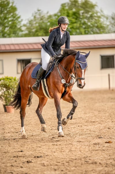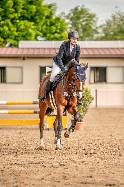 Montana is a stunning, charming, and well-mannered mare with an excellent work attitude and a wonderfully comfortable seat. She impresses with her rideability, her connection to her rider, and her motivation – she wants to please her rider and always works with engagement. Under saddle, she demonstrates willingness to perform, is light in the contact, and offers a pleasant, consistent connection. She can be ridden with gentle aids, requiring no excessive strength, and provides a very harmonious riding experience. In the show jumping ring, she is reliable, attentive, and always eager to go to the other side. Due to her rideability and good basic gaits, I can also easily envision her excelling in dressage. Montana is easy to re-ride for anyone and is well-behaved. However, she is not suitable as a beginner or children's horse. At competitions and in training, she jumps reliably and confidently (plank, water, series, wall, etc.), although she can be somewhat environmentally sensitive. Montana has competed up to A-level show jumping with scores up to 7.8, won a style jumping class with an 8.1, and has competed in young horse classes up to L. She took a break from competition last year due to my maternity leave, and I have also competed sparingly this year – so she remains relatively fresh. Montana is healthy, regularly vaccinated, dewormed, and osteopathically treated. Her teeth were checked and treated this year. She is also shoe- and loading-broomer safe. A trial ride is possible at any time by arrangement.