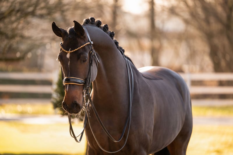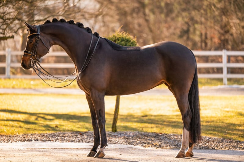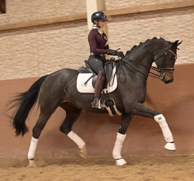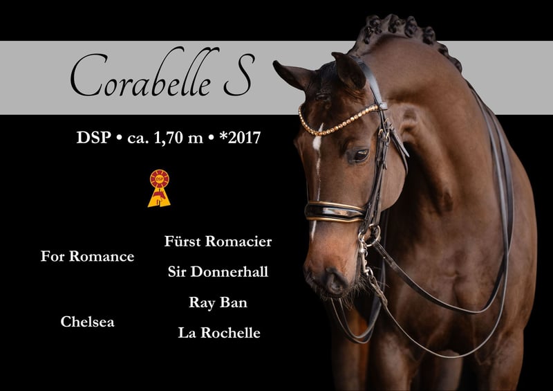 ⭐️Corabelle⭐️ Alter: 9 Jahre (2017) Größe: ca 1,69 m Abstammung: For Romance x Ray Ban Ausbildungsstand: mehrfach M* platziert AKU: Gute Röntgenbilder vorhanden Zum Verkauf steht die wunderschöne, dunkelbraune Stute Corabelle, eine beeindruckende For Romance-Tochter, die mit ihrer Leistungsbereitschaft, Rittigkeit und Qualität absolut überzeugt. Corabelle kann viele Platzierungen in den Klassen L & M* nachweisen und ist auf diesem Niveau sehr lektionssicher – eine tolle Partnerin für Reiter, die bereits solide Turniererfahrung suchen und dennoch Potenzial nach oben wünschen. Corabelle ist 11 Jahre alt und präsentiert sich als motivierte, menschenbezogene Stute, die ihrem Reiter stets gefallen möchte und mit einer durchweg positiven Arbeitseinstellung an jede Aufgabe herangeht. Sie zeigt eine sehr gute Versammlungsbereitschaft und bringt dabei viel Talent für die anspruchsvollere Dressurarbeit mit. Das Piaffieren wurde bereits an der Hand sowie unter dem Sattel angetestet – sie hat das Thema schon mit Potenzial angenommen und lässt hier definitiv auf mehr hoffen. Doch nicht nur im Viereck macht Corabelle Freude: Auch Sprünge meistert sie sehr gerne und zeigt sich insgesamt vielseitig einsetzbar. Zudem kennt sie Gelände und ist super brav und unkompliziert im Umgang.Ein weiteres Qualitätsmerkmal: Corabelle hat ihre Stutenleistungsprüfung erfolgreich absolviert, was ihre Veranlagung und ihren Charakter nochmals unterstreicht. Durch ihre hochinteressante Abstammung ist sie außerdem auch für die Zucht ein spannendes Pferd. Corabelle ist eine Stute, die Spaß macht, mitarbeitet und ihrem Menschen jeden Tag aufs Neue beweist, wie viel Herz und Qualität in ihr steckt.