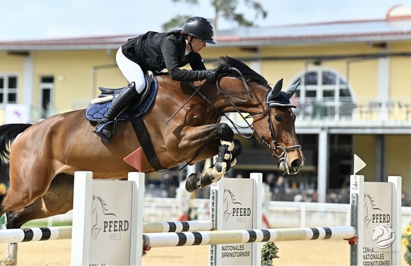 For sale is a approximately 16.1 hh, 9-year-old mare directly from the breeder. This modern, athletic mare is always performance-ready and has plenty of energy. She has won at 125 cm and has numerous placings up to 130 cm at international competitions. Thanks to her good attitude and ability, she is also suitable as an amateur horse. Please call for more information.