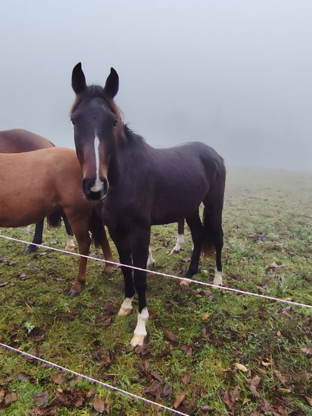 Unfortunately, we cannot keep all of them either. We are a small hobby breeder and only keep our mare foals. Clemens was born in 2022 and has grown up robustly within a herd. His sire is Castello Branco, who has achieved great success up to S*** level. His dam, Delaynie, was also born with us and has competed up to S* level in show jumping with our daughter. Delaynie is a half-bred mare by Domenico xx out of a Ferman-Lonely Boy-Landgraf-Indentat mare line. Clemens was our first foal and is currently approximately 160 cm tall, so not the tallest. As a gelding, he will still grow a few more centimeters, but there are also smaller riders out there. He is looking for HIS person—someone who has the time to work with him and develop him further. He is still quite raw, has been lunged, and is familiar with free jumping. For more information, please contact 01772423528. Please only get in touch if you are genuinely interested; anything else is a waste of time.