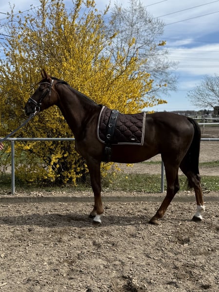 Talisman ist ein 4-jähriger, liebevoll aufgezogener Dunkelfuchs aus eigener Zucht, der durch seine besondere Ruhe, Klarheit und Menschenbezogenheit besticht. Er zeigt sich bereits jetzt als absolut verlässlicher Partner im Umgang und unter dem Sattel – ein Pferd, das Vertrauen schenkt und Sicherheit vermittelt. ✨ Sein Charakter: • ausgesprochen brav und umgänglich • menschenbezogen und freundlich • klar im Kopf, neugierig und lernwillig ✨ Ausbildung: • sicher im Umgang (führen, putzen, anbinden) • geht alleine problemlos auf den Hänger und wieder herunter • kennt Doppellonge • läuft über Trabstangen und macht kleine Sprünge • geht bereits alleine eine kleine Runde ins Gelände • Reiterwechsel kennt er ebenfalls Talisman ist für sein Alter außergewöhnlich abgeklärt und bringt eine tolle Basis mit. Er eignet sich ideal für Reiter, die ein junges Pferd weiter fördern möchten – auch für ambitionierte Einsteiger mit Unterstützung. ✨ Abstammung: Total Diamond x Contendro – leistungsgeprägt und interessant für vielseitige Förderung ✨ Besonderheit: Ein Pferd mit viel Herz und Charakter, das seinem Menschen gefallen möchte und dabei stets ehrlich bleibt. Für einen Termin zum Probereiten sind Sie jederzeit herzlich willkommen, wir nehmen uns hierfür ausreichend Zeit für Sie! Preis zzgl. gesetzlicher MwSt.