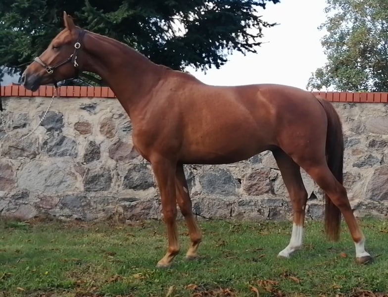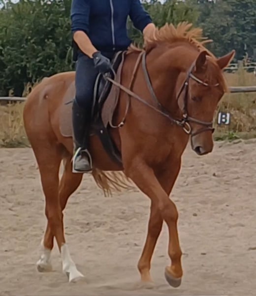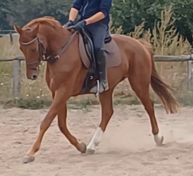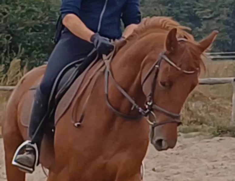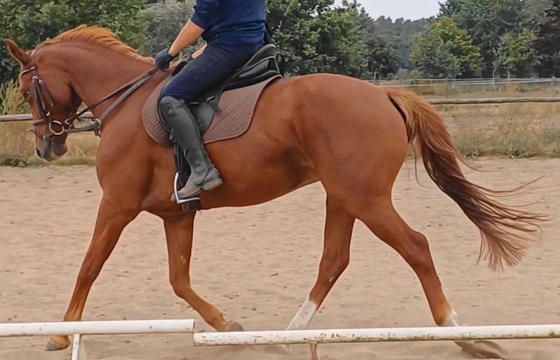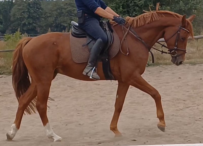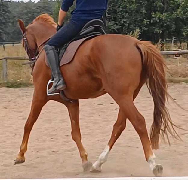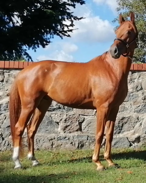 Unser Excalibur SB kommt im praktischen XS-Format daher, aber hat ein großes Herz an der richtigen Stelle! Freundlich, mutig und seinen Menschen stets treu - so ist der kleine Mann. Excalibur wurde 2023 spät angeritten und befindet sich zur weiteren Ausbildung im Brandenburgischen Haupt- und Landgestüt in Neustadt/Dosse. Da er auf einem Bauernhof geboren wurde und aufgewachsen ist, sind Maschinen wie Traktoren, Hoflader, Mini-Bagger bis hin zu Laubbläsern absoluter Alltag für ihn. Er ist dabei aufgeschlossen und beobachtet das Geschehen mit totaler Gelassenheit. Der alltägliche Umgang mit Menschen ist für Excalibur eine Freude. Er ist immer freundlich, unkompliziert und lässt sich gern ein Leckerchen reichen. Seine Koppel lag direkt neben einer Hundeschule, sodass dies für ihn absolute Routine ist. Auch Hühner aus dem benachbarten Garten sind kein Problem. Unser Excalibur mag die Gesellschaft von anderen Pferden und ist diese sein Leben lang gewohnt. So war er Weidebegleiter für verschiedene Wallache, u.a. auch einem Rentner, und hatte im Stall auch seine Pferdebox zwischen den Boxen von jungen Hengsten und Jährlingsstuten. Trotz seiner kompakten Größe lässt er sich nicht die Butter vom Brot nehmen, zeigt aber dennoch immer eine soziale Größe in dem er Schwächere beschützt. Sein Vater ist der Trakehner PrH Editorial. Editorial war der Reservesieger der Trakehnerkörung 2007. Die Nachkommen dieses Hengstes zeichnen sich durch viel Typ, überdurchschnittliche Grundgangarten und ein sehr gutes Interieur aus. Halbbruder von Editorial ist Imperio, der unter Hubertus Schmidt hoch erfolgreich war. Excalibur stammt aus einer Mutterlinie, die auf unsere Maika zurück führt. Die Pferde aus dieser Linie zeichnen sich sowohl im Sport- als auch im Freizeitbereich durch einen sehr guten Charakter und ihre vielseitige Einsatzbandbreite aus. So sind z.B. Lord Capri SB (S-platziert in der Dressur) oder Sabrina SB (Sportname Sabrina-Vera, siegreich in der Dressur M**) hervorzuheben. Sowie ein Santano SB, der sowohl vor der Kutsche aber auch als Voltigierpferd punkten konnte. Seine jüngere, größere Schwester ist die Staatsprämienstute Belissima SB. Aufgrund seines hohen Blutanteils der Trakehner, aber auch Vollblut (Montano - Modus xx) verfügt Excalibur über einen eleganten, leichten Typ mit bester Kondition für Strecken. Matsch und co. sind kein Problem und stören ihn nicht.