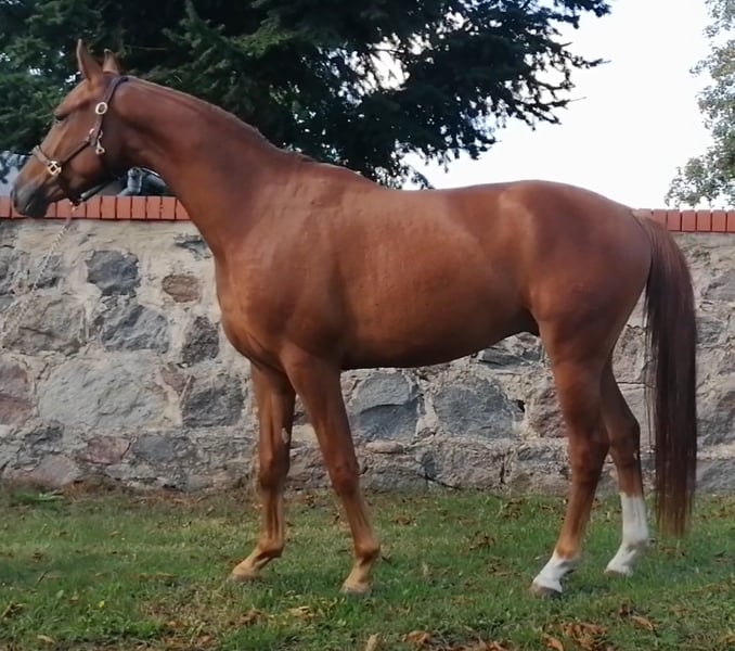 Our Excalibur SB comes in a practical XS size, but has a big heart where it counts! Friendly, brave, and always loyal to his human – that’s the little fellow. Excalibur was lightly backed in late 2023 and is currently in training at the Brandenburg State Stud in Neustadt/Dosse. Born and raised on a farm, he is completely accustomed to machinery such as tractors, front loaders, mini excavators, and leaf blowers. He approaches these with an open mind and observes everything with total calmness. Daily interactions with people are a joy for Excalibur. He is always friendly, straightforward, and happy to accept a treat. His paddock is located right next to a dog training school, so that is routine for him. Chickens from the neighboring garden are no problem either. Our Excalibur enjoys the company of other horses and has been used to it all his life. He has served as a pasture companion for various geldings, including an older horse, and has shared his stable box with young stallions and yearling mares. Despite his compact size, he is not easily pushed around but always demonstrates social maturity by protecting the weaker individuals. His sire is the Trakehner PrH Editorial. Editorial was the reserve champion at the 2007 Trakehner licensing. His offspring are known for their type, above-average gaits, and excellent temperament. A half-brother of Editorial is Imperio, who achieved great success under Hubertus Schmidt. Excalibur comes from a maternal line that traces back to our mare Maika. Horses from this line are known for their excellent character and versatility in both sport and leisure riding. Notable descendants include Lord Capri SB (placed in S-level dressage) and Sabrina SB (rider name Sabrina-Vera, winner in M** level dressage). There’s also a Santano SB, who excelled both in harness and as a vaulting horse. His younger, larger sister is the state-premium mare Belissima SB. Thanks to his high Trakehner bloodlines, as well as full-blood (Montano - Modus xx), Excalibur has an elegant, light build with excellent stamina for long distances. Mud and rough terrain are no problem and do not bother him.