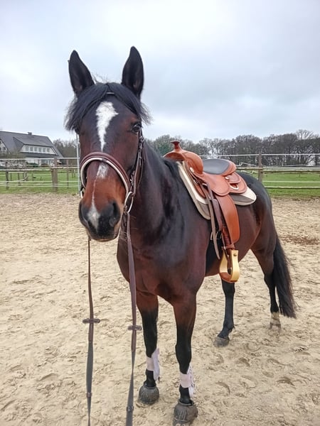 -Traber Stute - 1,63m groß - 6 Jahre alt (wird Ende März 7) -schmiedefromm -steht in gemischter Herde (rangmittig) -Kein Anfängerpferd Sie hatte 2023 einen Weideunfall dadurch zog sie sich einen Riss im Meniskus zu. Die Bänder und Sehnen sind dabei gott sei dank nicht verletzt worden. Röntgenbilder liegen vor. Aktuell keine Probleme mit dem Knie und voll reitbar. Sie braucht einen ruhigen,konsequenten Reiter der ihr Zeit und Sicherheit gibt. Auf dem Reitplatz kann man sie gut reiten ,noch etwas unausbalanciert und muss weiter gefördert werden. Im Gelände sehr hektisch und nervös (mehr dazu gern telefonisch) Von den Vorbesitzern weiß ich das sie einen Bockhuf hatte, sie wurde aber im Alter von 4Monaten operiert. Somit sieht man es nur noch wenn man genau hinschaut(siehe Bilder) Wenn sie als Zuchtstute verkauft wird, wird selbstverständlich auch der Fohlenschein mit ausgehändigt. Bei ernsthaftem Interesse oder Fragen gern melden. Ich wünsche mir für sie einen Platz mit viel Bewegung, könnte mir auch eine Offenstallhaltung in kleiner Gruppe vorstellen.