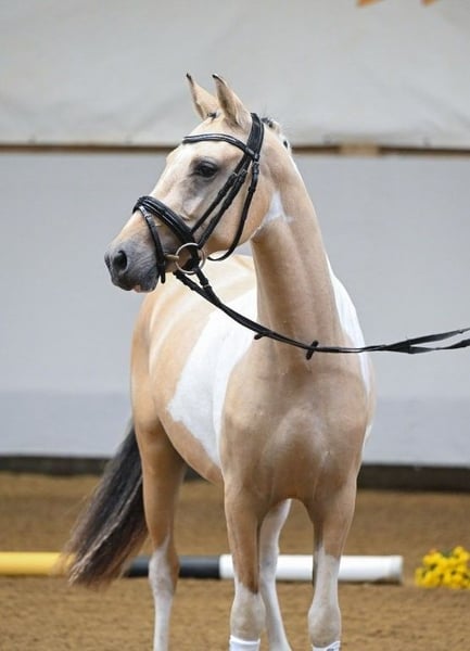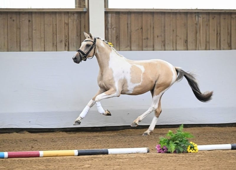 **Sales Advertisement: German Riding Pony Stallion** For sale is a promising German Riding Pony stallion, born in 2023, with a current height of 142 cm. His color is officially: Earthy Isabel Sabino. Not available for selection. This stallion is characterized by his friendly nature and willingness to learn. He is well suited for dressage and already shows promising potential in free jumping. He is lunged, fully vetted, including back X-rayed. "Zwerg" (his nickname) is well socialized (grew up in a stallion herd) and has an impeccable character. If you are interested or need further information, please feel free to contact me. Visit us and see for yourself this wonderful pony.