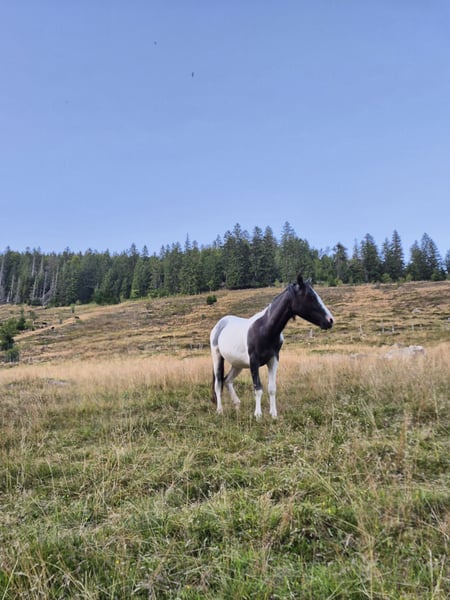 Very calm and kind stallion with a blue eye. Silver spotted. Suitable for leisure riders. Family horse. Grows up healthy on our large Black Forest pastures, in a herd. - Sturdy build - Easy to handle - Approved - Papers ZfdP Mother: Bella (Pony without pedigree) Father: Ben Hour (Lewitzer mix, see stallion advertisement) **Entering the yard and pastures of the establishment for viewings and riding of sale horses is always at your own risk! Exclusion of any warranty! For trial riding of our sale horses, we charge €50. This amount will be deducted from the purchase price of a horse.**