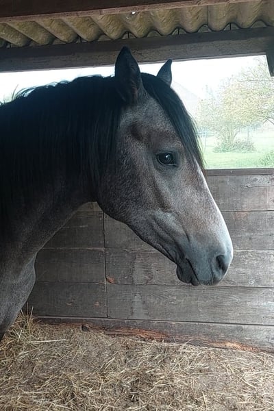 Cosmo Grey ist ein fast dreijähriger, wunderschöner und sportlich-moderner Reitpony-Hengst der ins Endmaß wachsen wird. Auch aufgrund seiner Abstammung, seiner 3 sehr guten GGA, der hervorragenden Leistungsbereitschaft und Lernfähigkeit hat er alle Chancen auf eine Sportkarriere oder Köraspirant zu werden und in den Zuchteinsatz zu gehen.Er ist bei uns geboren sowie liebevoll und artgerecht aufgewachsen. Cosmo hat eine außergewöhnliche Fellfarbe, zur Zeit dunkelbraun -stichelhaarig, kann aber dunkler Schimmel werden. Er kennt Bodenarbeit,Trense,Longe und ist auch beim Schmied und Hänger fahren artig. Er ist selbstverständlich regelmäßig entwurmt und geimpft.