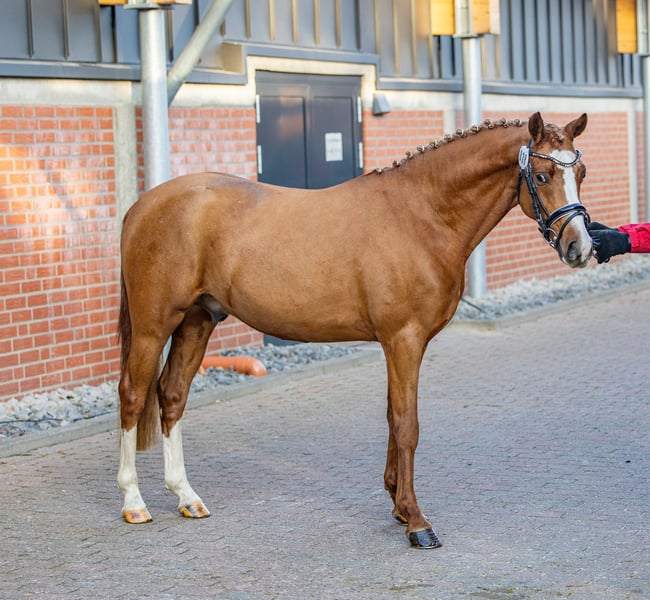 For Sale: German Riding Pony Stallion – Chestnut, born 2023 We are offering a beautiful, licensed German Riding Pony stallion born in 2023, from a performance-oriented mare line. With his striking appearance, he is sure to turn heads. The pony stands approximately 150 cm (14.3 hh) and is ideally suited for dressage. He impresses with his friendly nature, eagerness to learn, and pleasant temperament. The young stallion is very well-mannered and shows great potential for dressage. Videos from his licensing are available on ClipMyHorse. Please feel free to contact me for more information or if you are interested. Arrange a viewing to meet this promising pony in person!