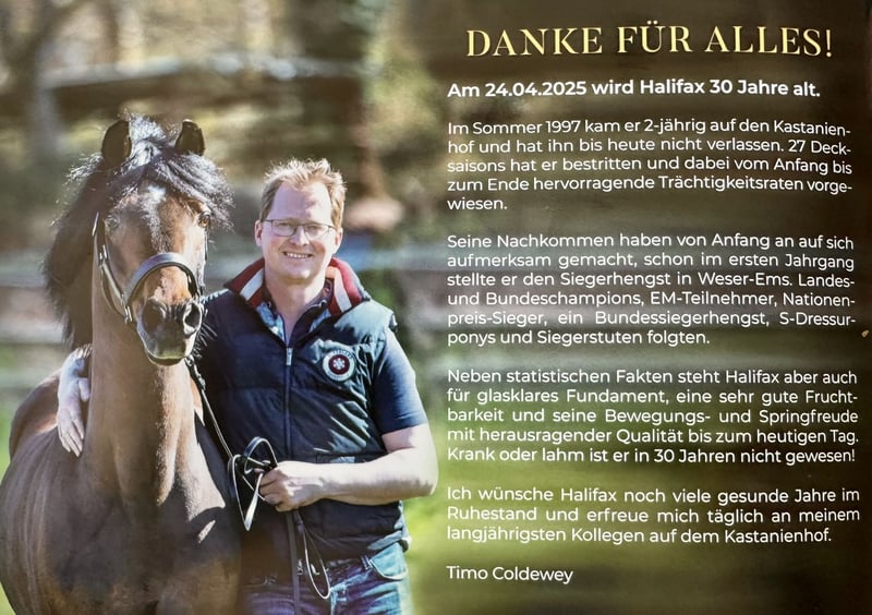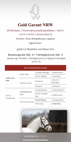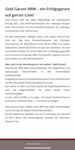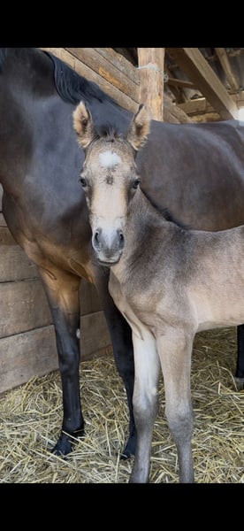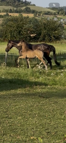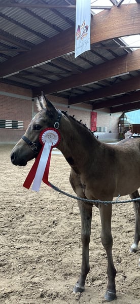 ⭐️ Absoluut alleen in waarderende, ondersteunende en familiale handen te koop. Het is geen noodverkoop en hij moet ook geen wisseltrofee worden. ⭐️ „Gentleman Jack“ is een hengstveulen geboren op 01-06-2025 van de succesvolle „Gold Garant NRW“, die in heel Duitsland al talrijke prijswinnaars en veilingveulens heeft voortgebracht. De moeder van „Gentleman Jack“ stamt af van de elitehengst Halifax, die vooral bekend staat om zijn veelzijdige nakomelingen in alle disciplines en zijn uitstekende temperament. Onlangs heeft zij bovendien de elite merriekeuring van de Ponyvereniging Hessen gewonnen. Al nu laat de kleine, zelfverzekerde en onbevreesde jongeman zien welk potentieel er in hem zit, geërfd van zijn ouders. Voorzien van drie uitstekende, elastische, bergopwaarts gebouwde basisgangen, met ontzettend veel type en aanwezigheid, werd hij op de veulenkeuring onderscheiden met de veulenpremie. „Gentleman Jack“ kan al alles wat een veulen moet kunnen. Hij is halstergebonden, hoefsmid- en laadvriendelijk, laat zich borstelen en overal aanraken. Uiteraard wordt hij regelmatig ontwormd en aan de hoefsmid voorgesteld. Dit is geen massakweek en -opfok; integendeel, er wordt veel geduld en liefde in hem gestoken, en daarom zal hij niet voor de helaas momenteel gangbare „dumpprijzen“ worden verkocht. Een ziektekosten- en levensverzekering van „Agria Dierenverzekering“ kan worden overgenomen. Zijn kwaliteit en genetica spreken voor zich, en hij is dan ook beslist een kandidaat voor de hengstenkeuring. Wie de kleine man wil leren kennen, is van harte welkom.