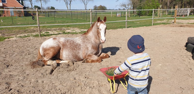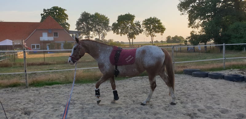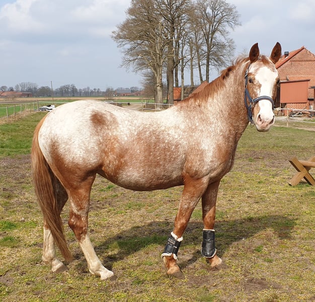 Our Seraphina (Fina) is an absolute dream. She is a colorful eye-catcher, loyal, intelligent, and very well-trained. Unfortunately, I have to admit with a heavy heart that I can no longer provide her with what she needs, given my two young children. She prefers to spend as much time as possible with her people. Seraphina is a German Riding Pony / Quarter Horse cross. Fina has been gently backed and then exercised by me in a relaxed, bitless manner. However, due to my pregnancy, she has not been ridden for a longer period. She has inherited a slight sway-back from her mother, which means she is not a weight carrier. If you have any questions about Fina, please feel free to contact me. We will only place her in the very best hands, as it is truly very difficult for me. Price is of secondary importance in this case.