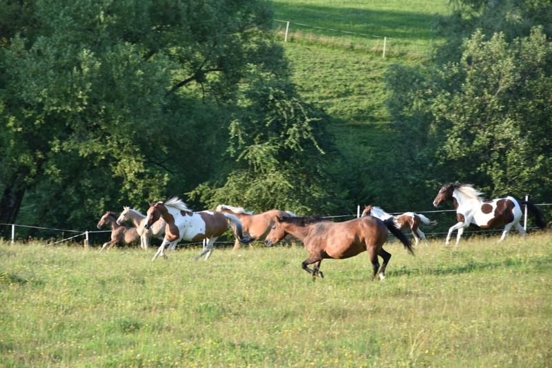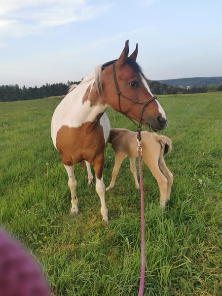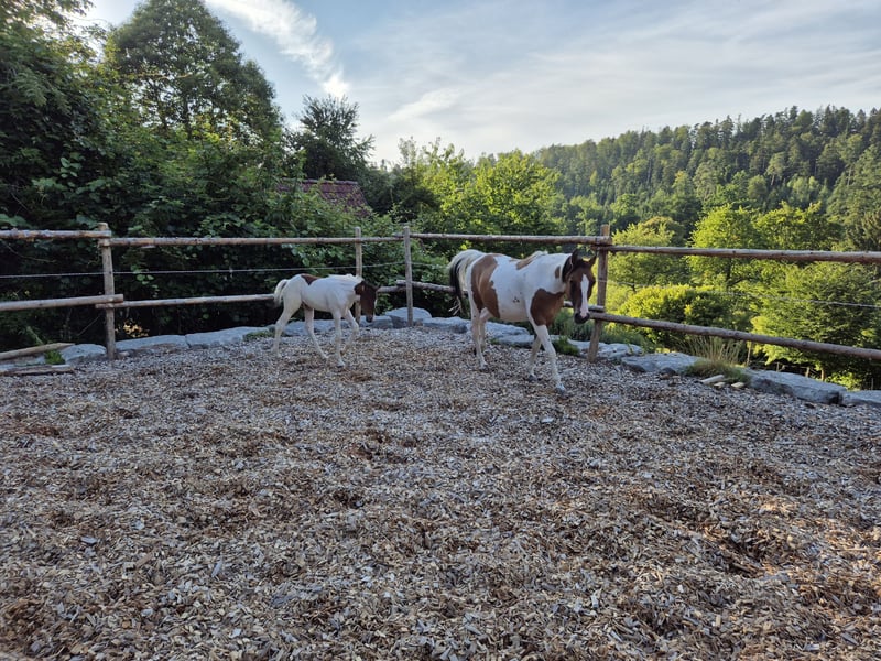 Absoluter Ausnahmeverkauf: Nach langer Überlegung haben wir uns entschlossen unsere 14-jährige Scheckstute "Romy" (im Pass "Ramona") zu verkaufen *27.05.2011 Stm: 149cm Mutter: Dt. Reitpony "Darinka" (fuchs) Mutter-Vater: der erfolgreiche Dt. Reitponyhengst - Don't Worry (fuchs) Vater: Lewitzerhengst "Romeo" --> Abstamung s. Bilder Romy ist eine ausdrucksstarke Dt. Reitponystute mit wundervoller, besonderer Braunscheckung. Sie ist seit 2019 in unserem Besitz. Romy ist eine tolle Zuchtstute und gute Mutter und hat uns hier problemlos 4 wunderbare Quarter-Pony Fohlen geboren. Aus diesem Grund dürften wir sie eigentlich nicht verkaufen. Aber Romy ist eben auch sehr fein ausgebildet und sehr menschenbezogen. Ich habe den Eindruck sie möchte mehr als "nur" eine Zuchtstute sein. Leider fehlt uns hier die Zeit für sie. Und es ist schade, dieses sensible Pferd so selten zu reiten bzw. mit ihr am Boden zu arbeiten. Was beider viel Spaß macht mit ihr. Deshalb haben wir sie dieses Jahr nicht mehr belegt. Romy hat auf den Bilder zwar einen Westernsattel an, weil dieser gut passt, ist aber klassisch ausgebildet! Durch ihre Lewitzer-Abstammung ist sie natürlich blütig und hat Go. Man muss sie also nicht treiben, dennoch lässt sie sich gut händeln, reagiert direkt auf feine Hilfen. Ich reite sie im Gelände gebisslos. Obwohl sie mit unseren Grauvieh-Kühen ab und zu zusammen auf der Weide steht, reagiert sie manchmal ängstlich auf Fleckvieh-Kühe im Gelände. Das ist aber auch schon das einzige Manko, was ich von Anfang an bei ihr beobachte... Mit etwas Training wird sich aber auch das vermutlich verflüchtigen. Aktuell hat sie noch "Finest Rocco" ein Quarter-Pony Scheckhengst (Vater: QH "EH one of Lena's Finest) bei Fuß. Er ist am 06.06.2025 geboren. Daher kann Romy unseren Hof frühestens im Januar 2026 verlassen. Falls jemand eine Stute inkl. Hengst-Fohlen sucht, wäre das natürlich auch möglich. Zusammen könnten wir die beiden ab sofort abgeben. Das äußerst gelungene QP Henstfohlen "Finest Rocco" wird beim ZSSE e.V. eingetragen, gechipt, entwurmt und Tet. geimpft abgegeben. Hierbei handelt es sich um eine seltene Gelegenheit. Von unserem Hof werden meistens nur Jungpferde abgegeben. Für beide kommt nur ein artgerechtes neues Zuhause und gefühlvolle Reiter in Frage. Wir freuen uns, wenn beide zusammen einen neuen Platz finden und würden hier auf 7T. entgegen kommen. Einzeln kostet Romy 5.500€ VB und Rocco 3.000€. Bei uns gilt immer: Desto artgerechter der zukünftige Platz, desto größer die Verhandlungsbereitschaft. Und Preisverhandlungen führe ich nur vor Ort! Für Fragen zur Romy und Rocco bzw. Terminvereinbarungen über Besichtigungen freu ich mich über nette Nachrichten...
