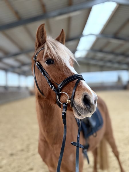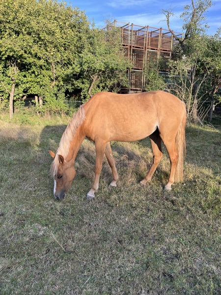 Our beautiful 3-year-old pony mare is looking for a loving new home. She has been gently backed and consistently shows herself to be very well-behaved, balanced, and resilient. She has no vices such as bucking and handles everything calmly and with motivation. Our 11-year-old son rides her regularly, and she always remains patient and reliable. Despite her young age, she is already a true family pony with heart and character. Currently, she is still in training and is actively growing and developing. She is approximately 14 hands (140 cm) tall at the moment. With further time and gentle encouragement, she will undoubtedly continue to develop nicely—both physically and in her riding abilities. Pedigree: Sire: Donatelli Dam Sire: Dornik B Dam: Dynamik Star This lineage promises not only quality but also rideability and willingness to perform—combined with a wonderful pony character that truly convinces! A young talent with excellent potential—ideal for someone who enjoys further training and building a trusting partnership. Serious inquiries are welcome by phone or message!