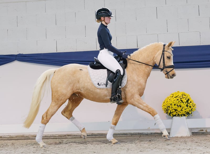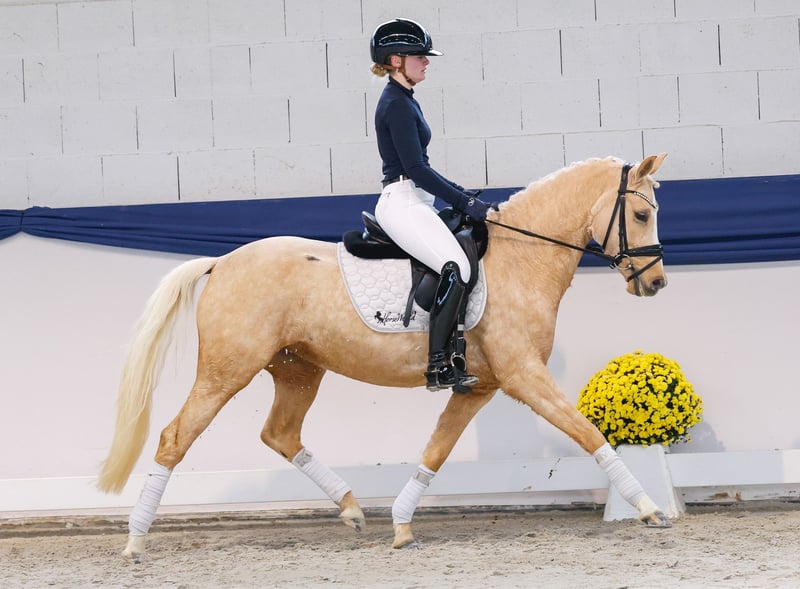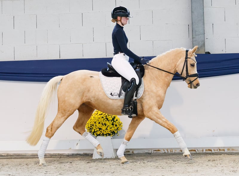In unserer Kollektion stehen streng selektierte Reitponys f�r alle Anspr�che: Ausbildungs-, Zucht- und Kinderponys Hier gelangen Sie zur Gesamtkollektion: https://ponyforum.auction Die vierjährige Dating April ist eine superliebe und ausgeglichene Stute, ganz anhänglich und unkompliziert in allen Lebenslagen. Die hübsche Palominodame hat eine umfassende Grundausbildung erhalten und kann bei kontinuierlicher Winterarbeit und Konditionsaufbau in Dressurpferdeprüfungen eingesetzt werden. Sie hat eine hervorragende Arbeitseinstellung und versucht ihren Reiter wirklich immer zu verstehen. Bei ihren Besitzern hat sie auch schon Erfahrung als Longenpony mit einem kleinen Kind im Sattel gesammelt, auch hier war ihr Vorzeigecharakter immer beispielhaft. Vater Dating AT NRW ist aktueller Sieger in Dressurprüfungen der Klasse S und auch der interessante Mutterstamm der Stute lässt Ponyfans aufhorchen! Ihre Mutter ist zum Beispiel eine Schwester des Siegerhengstes und Bundeschampions Caramel FH, sie war selbst Bundeschampionatsteilnehmerin. Dies ist der Mutterstamm der berühmten Golden Felina, der zahlreiche Erfolgsponys hervorbrachte.