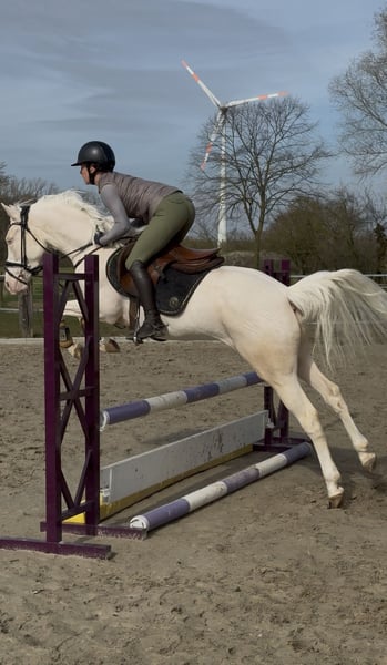 Zum verkauf steht eine bildhübsche 4 jährige deutsche Reitponystute in begehrter Perlino-Farbe. Abstammend von Champ de Luxe (FS Champion de Luxe einer der prägendsten Dressurponyhengste - Bundessiegerhengst, mehrfacher Championatsteilnehmer und ein top, top Vererber). Sie überzeugt mit drei qualitätsvollen Grundgangarten, sehr guter Mechanik und viel Elastizität. Besonders hervorzuheben sind ihr bergauf angelegter Galopp und ihr taktsicherer, schwungvoller Trab – beste Voraussetzungen für eine erfolgreiche sportliche Laufbahn. Super gut angelegtes Freispringen, sowie Parcoursspringen. Unter dem Sattel zeigt sie sich rittig, lernwillig und altersgemäß unkompliziert. Sie bringt ein angenehmes Go mit, bleibt dabei aber stets regulierbar und klar im Kopf. Auch auf dem Turnier wurde sie bereits von einem 12 jährigen Mädchen zwischen den Profis vorgestellt. Hier präsentiert sie sich souverän, entspannt und ohne zu gucken, auch bei den Richtern kommt sie stets gut an! Beste Perspektive für eine erfolgreiche Zukunft im Sport! Eine hochinteressante Nachwuchsstute für ambitionierte Reiter:innen, die Qualität, Größe und besondere Farbe vereinen möchten. Verladefromm, super verträglich mit anderen Pferden und Ponys. Kennt Trecker, Hunde, Katzen, Kinder. Ein aktueller TÜV ohne Befund liegt vor!