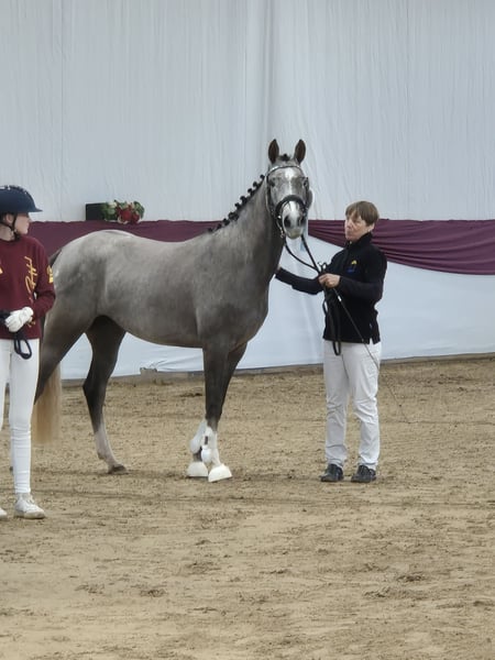 Bagis C'est Fleur è una bellissima cavalla grigia con ottimi passi di base, è arrivata terza nella competizione di libertà a Marbach. Fleuri è molto affettuosa e legata all'uomo, ma ha anche la giusta energia per una carriera sportiva. Sua madre era una cavalla premiata e anche sua sorella, entrambe le fattrici sono assolutamente adatte ai bambini, sia nel maneggiarle che nel montarle in tutte le discipline. Il suo fratello intero Cooper One è stato il cavallo di punta all'asta Elite di Riedlingen ed è diventato vice campione regionale nel 2024! Anche sua sorella piena è stata ammessa all'asta Elite ed è diventata cavallo di punta. Nel 2024, un'altra sorella con il suo puledro Bagis Dreamer ha completato il tris e ha anche raggiunto il cavallo di punta! Il triplo è una tradizione di famiglia. Il padre DSP Cosmo Royale è stato tre volte campione nazionale e vincitore internazionale in prove FEI. Ha già prodotto molti discendenti di grande successo e con ottimi movimenti. Fleuri dovrebbe continuare questa straordinaria linea nella mia allevamento. A causa di problemi fisici da parte mia, ho preso la difficile decisione di abbandonare l'allevamento e separarmi dai miei pony. A causa di questi problemi di salute, ho finora fatto poco con lei, ma tutto ciò che ho fatto, lei lo ha accettato immediatamente. È stata lungata, conosce sella e lunghe cinghie e c'è già stata qualcuno sopra di lei. Qui si presenta l'opportunità di avere un pony davvero fantastico e naturalmente vorrei che fosse in buone mani.
