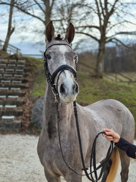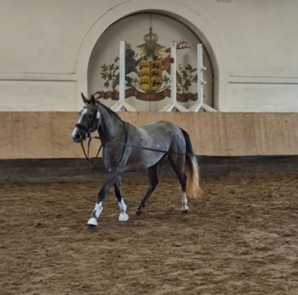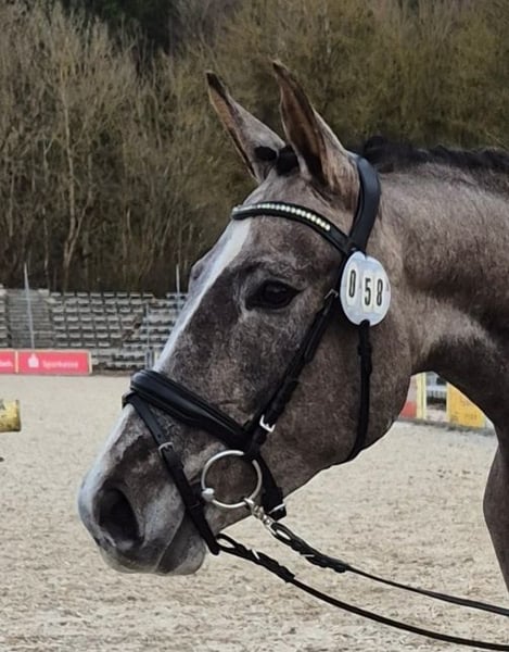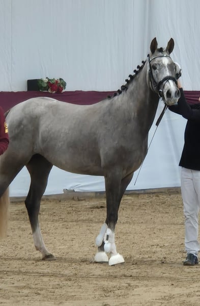 Bagis C'est Fleur est une magnifique jument grise avec d'excellentes allures fondamentales, elle a terminé 3ème au concours de liberté à Marbach. Fleuri est très attachée aux humains et aime les câlins, mais elle a aussi le nécessaire pour une carrière sportive. Sa mère était une jument primée d'État et sa sœur également, les deux juments sont absolument adaptées aux enfants, tant dans le maniement que dans l'équitation dans toutes les disciplines. Son frère de même père, Cooper One, a été le meilleur prix à la vente élite à Riedlingen et a été vice-champion régional en 2024 ! Sa sœur pleine a également été admise à la vente élite et a obtenu le meilleur prix. En 2024, une autre sœur avec son poulain Bagis Dreamer a parfaitement complété le triplet et a également obtenu le meilleur prix ! Le triplet est dans la famille. Le père, DSP Cosmo Royale, a lui-même été trois fois champion des champions et vainqueur international dans des épreuves FEI. Il a déjà produit de nombreux descendants très performants et aux allures impressionnantes. Fleuri devrait continuer cette magnifique lignée dans mon élevage. En raison de problèmes de santé de ma part, j'ai pris la décision difficile d'arrêter l'élevage et de me séparer de mes poneys. À cause de ces problèmes de santé, je n'ai jusqu'à présent fait que peu de choses avec elle, mais tout ce que j'ai fait, elle l'a immédiatement accepté avec enthousiasme. Elle est longe, connaît la selle et les rênes allemandes, et quelqu'un a déjà été dessus. C'est une véritable opportunité pour un super poney et je souhaite bien sûr qu'elle soit entre de bonnes mains.