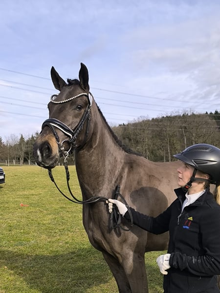 This 3-year-old pony mare has very good quality and already impressed at the competition with a 2nd place in a riding horse test, where she received partial scores of up to 8.5. Coffee is light in the contact and already well ridden. In unfamiliar environments, whether at competitions or on trails, she behaves exceptionally confident and balanced for her age. She is a positively self-assured mare, very compatible with other horses, and well-mannered. In handling, she is very relaxed and has the desired go under the rider without getting hot. She is a training pony with a great future ahead of her and will also be able to collect easily later on. The pony is freshly vetted, clinically sound, and has excellent X-rays + back. We bought Coffee as a foal, and now she is ready to move to a new, wonderful home. A complete video can be sent upon request.