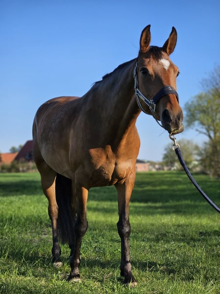 Wir müssen das Pony leider aus privaten Gründen zeitnah abgeben, da unsere Kinder es nicht mehr reiten. Zum Verkauf steht eine wunderschöne braune Deutsche Reitpony Stute aus April 2019. Sie hat ein Stockmaß von 144 cm und deckt auch Erwachsene gut ab. Sie wurde mit 4,5 Jahren schonend angeritten, stammt von DARK HIGHLIGHT AT x D-DAY AT ab und ist auch als Zuchtstute eingetragen. Sie hat eine ansprechende Erscheinung, einen freundlichen Charakter und eine hohe Lernbereitschaft. Die Stute hat ein gutes Grundtempo, ist brav im Umgang und in allen drei Gangarten gut zu reiten (mit und ohne Ausbinder) und dabei auf einem soliden A-Niveau. Auch erste Sprünge unterm Reiter hat sie bereits absolviert, dies wurde jedoch noch nicht weiter vertieft, da wir uns auf die Dressur konzentriert haben. Beim Freispringen zeigt sie viel Spaß und Potenzial. Sie hat sehr gute Hufe und ist barhuf unterwegs. Beim Hufschmied zeigt sie sich stets fromm. Sie ist kein Anfänger- oder reines Kinderpony und braucht einen erfahrenen und konsequenten Reiter, der sie weiter ausbilden und fördern kann. Im Umgang mit unsicheren Reitern zeigt sie sich manchmal etwas schreckhaft, was jedoch durch vom Reiter vermittelte Sicherheit ausgeglichen werden kann, hier braucht sie einfach noch mehr Erfahrung. Sie ist aktuell geimpft, entwurmt und besitzt einen aktuellen Pass. Sie steht momentan in Boxenhaltung, in einer gemischten Herde aus alten und jungen Ponys, wo sie sich sehr verträglich zeigt. Gesundheitlich hat sie sich bei uns robust und unanfällig gezeigt, eine AKU auf eigene Kosten kann gerne von einem Tierarzt nach Wahl durchgeführt werden. Eventuell kommt auch eine Zurverfügungstellung (bei voller Kostenübernahme) in einen näheren Umkreis für uns in Frage. Für weitere Informationen oder einen Besichtigungstermin stehe ich Ihnen gerne zur Verfügung, bitte kontaktieren Sie mich per Mail, gerne rufe ich auch zurück. Videos können gerne auf Anfrage zugesendet werden. Melden Sie sich gerne bei Interesse!