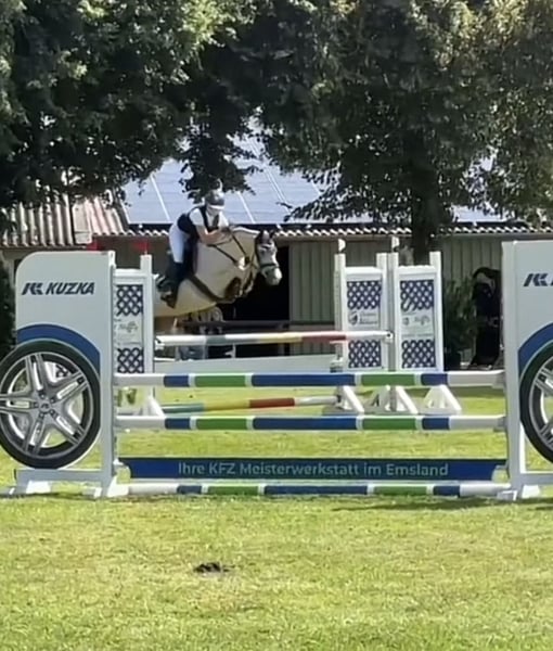 Mrs. Robinson est une jument élégante avec trois allures de base très bonnes, beaucoup de sang, ainsi qu’une bonne conscience de ses distances en saut d’obstacles. Après avoir donné naissance à un poulain, elle a été introduite cette année au sport de concours et a immédiatement décroché plusieurs rubans d’or ! Elle a connu du succès aussi bien en saut en liberté de la classe A* qu’en aptitude, qu’elle a également remportée. Sur le parcours, elle donne une sensation positive au cavalier et aide même en cas de mauvaises distances, sans faire de reproches. Elle est courageuse et n’a aucun problème avec des sauts exceptionnels, comme les fosses d’eau. Mais elle impressionne également en dressage. Elle a déjà obtenu une note de 7,5 en dressage et de 7,9 en saut lors de son évaluation. Elle se déplace aussi bien à l’arrière qu’à l’avant et maîtrise déjà plusieurs exercices de niveau L. Mrs. Robinson est parfaitement sage lors des sorties à l’extérieur et prend même plaisir à traverser l’eau. C’est pourquoi, en raison de son allure ample au galop, nous pouvons également l’imaginer comme un poney d’endurance. Étant donné qu’il s’agit d’un jeune poney dont la sécurité doit être assurée par le cavalier, Mrs. Robinson n’est pas proposée comme poney pour débutants.