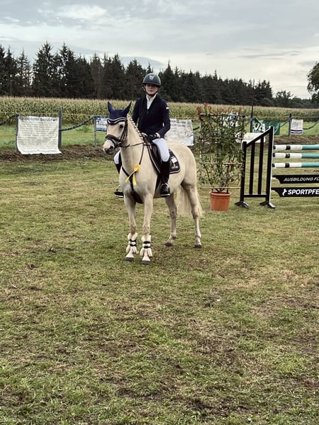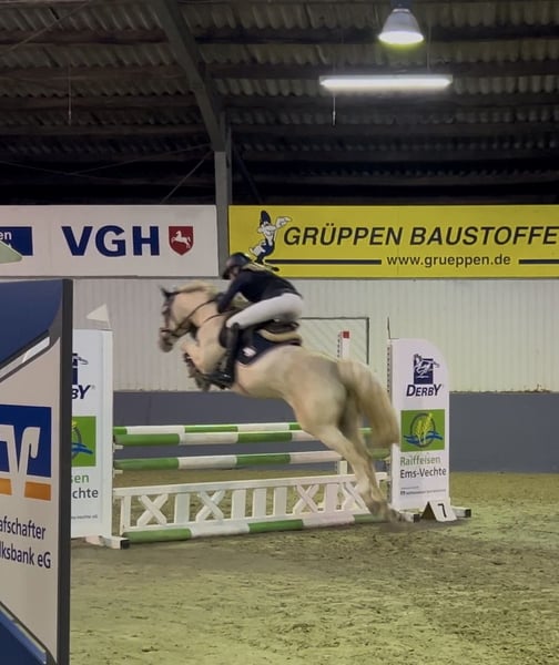 Mrs. Robinson ist eine schicke Stute mit drei sehr guten Grundgangarten und viel Vermögen, sowie Übersicht am Sprung. Nach dem sie ein Fohlen bekommen hat, wurde sie dieses Jahr das erste Mal an den Turniersport herangeführt und konnte sich direkt einige goldene Schleifen abholen! Nicht nur in Clearroundspringen der Klasse A* sonder auch in der Eignung war Mrs. Robinson erfolgreich und konnte diese gewinnen. Im Parcours gibt sie dem Reiter ein gutes Gefühl und hilft auch mal bei Fehldistanzen, ohne nachtragend zu sein. Sie ist mutig und hat kein Problem mit außergewöhnlichen Sprüngen, wie Wassergräben. Aber auch in der Dressur ist sie überzeugend. So konnte sie bereits eine Eignung für sich entscheiden (Dressur 7,5 ; Springen 7,9). Sie läuft in der Abteilung sowohl hinten als auch vorne und beherrscht schon einige Lektionen der Klasse L. Mrs. Robinson ist beim Ausreiten super brav und hat sogar Spaß daran, durchs Wasser zu gehen. Deswegen und aufgrund ihres raumgreifenden Gallops könnten wir sie uns auch gut als Vielseitigkeitspony vorstellen. Da es sich um eine in junges Pony handelt, welchem Sicherheit durch den Reiter vermittelt werden sollte, wird Mrs. Robinson nicht als Anfängerpony angeboten.