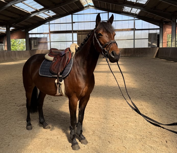 Hedwig ist eine charmante 7-jährige Ponystute mit einem Stockmaß von 1,43 m, was sie zum idealen Pony für Kinder macht, die einen verlässlichen Partner suchen. Mit ihrem ausgeglichenen Wesen und ihrer freundlichen Art begeistert sie im täglichen Umgang ebenso wie unter dem Sattel. Sie ist sehr menschenbezogen und hat keinerlei Unarten. In der täglichen Arbeit überzeugt sie durch ihre Rittigkeit. Sie reagiert fein auf alle Hilfen und ist stets motiviert, etwas Neues zu lernen. Im Parcours ist sie ehrgeizig und aufmerksam, bleibt dabei aber immer händelbar. Egal ob Springen, Dressur oder Gelände Hedwig zeigt sich stets sicher und gelassen. Sie ist ein echtes Verlasspony, das auch jüngeren, unsicheren Reitern und Reitanfängern Vertrauen schenkt. Sie kennt Offenstall sowie Boxenhaltung. Mit anderen Pferden ist sie gut verträglich und fügt sich problemlos in bestehende Herden ein. Ein rundum tolles, vielseitiges Pony, das Kinderherzen höherschlagen lässt und ein treuer Begleiter für gemeinsame Abenteuer sein kann. Wenn Hedwig euer Interesse geweckt hat, meldet euch gerne für weitere Informationen und Videos über WhatsApp unter +49 170 3874473.