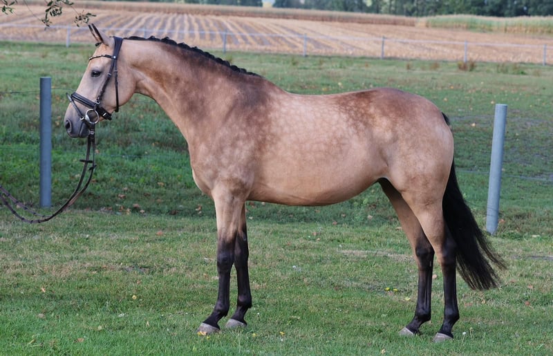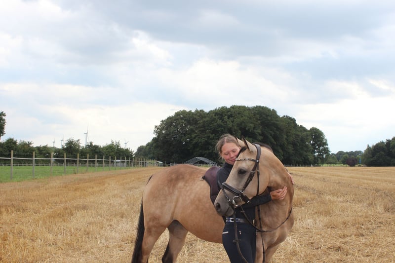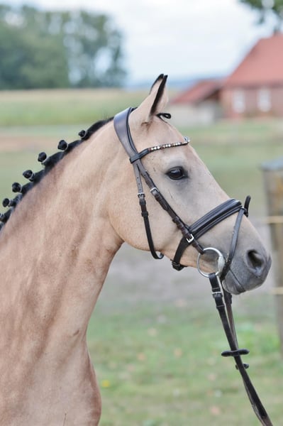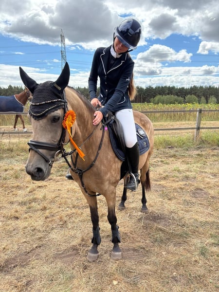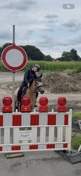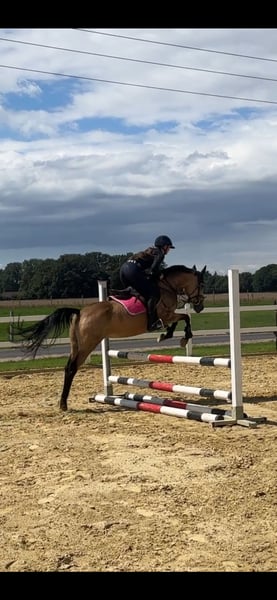 I am selling my 7-year-old German Riding Pony mare. Dimensions: AT x Noir De Luxe Cuba measures 1.44 meters at the withers. She is currently competing in show jumping at E-level and has competed up to 70 cm at competitions. Last year, she also competed in dressage up to class A, although I primarily focus on her jumping training. When hacking alone or with other horses, she is always very calm and enjoys it. She has also bravely handled her first small cross-country jumps. She is used to being lunged by small children from a young age. At our farm, there is always a lot of activity (holiday operation), but this is no problem for Cuba. She is also fine with dogs or passing large trucks. I am approximately 1.70 meters tall, and she still suits me quite well. Currently, she shares a pasture with a mare and a gelding during the day and is in her box at night.