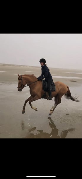 Delia is a 6-year-old German Riding Pony, approximately 1.47 meters tall. She is very manageable in the field, even around children or nervous riders, and can be ridden alone in the terrain without any issues. She is very brave and enjoys her daily work. In the arena, she is always well-behaved despite having plenty of go. She is happy to jump small fences, although jumping is not her true passion. She loads calmly onto the trailer and is gentle during hoof care. Her teeth are regularly checked, and she has seen the osteopath and saddle fitter regularly. At three months old, she developed a sway back, which does not cause her any problems. Nevertheless, she needs to be trained from the ground accordingly. Due to her sway back, she is not suitable as a weight-bearing horse; she should weigh under 60 kg. I have worked extensively with her from the ground, including double longe, liberty work, free jumping, regular lunging, and shock training. I can imagine her as a mother-daughter pair, but an experienced person should be present to actively train against her sway back. Thanks to her fearless nature in the field, I also see Delia as an excellent carriage pony. I have already started breaking her in, including long rein work, even in the terrain. Currently, she is kept in an open stable, as a box stall is not suitable for her. Due to her back, despite her excellent pedigree, she is not suitable for breeding. I hope to find her a wonderful new home through this.