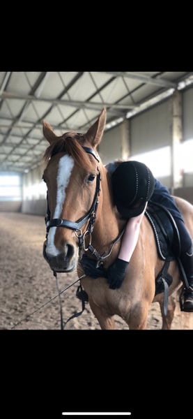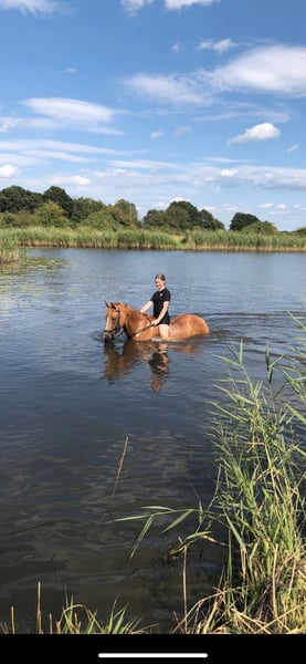 Delia is 6 years old, a German Riding Pony, and approximately 1.47 m tall. She is very manageable in the field, even for children or nervous riders, and going alone into the terrain is no problem! She is very brave and enjoys her daily work. In the arena, she is always well-behaved despite having plenty of go, and she is happy to do small jumps, although this is not her real passion. She loads calmly onto the trailer and is gentle during hoof care. Her teeth are regularly checked, and she has also been seen regularly by the osteopath and saddle fitter. At three months old, she developed a sway back, which does not cause her any problems, but she still needs to be trained from the ground accordingly! Due to her sway back, she is not suitable as a weight carrier; she should weigh under 60 kg. I have also worked a lot with her from the ground: she knows double longe, free work, free jumping, regular lunging, and desensitization training. I can imagine her as a mother-child pair, but an experienced person should be involved to actively train against the sway back. Thanks to her bravery in the field, I also see her as an excellent driving pony. I have already started lunging work with her, including long-rein work, even in the terrain. Currently, she is kept in an open stable; a pure box stall is not an option for her! Due to her back, despite her excellent pedigree, she is not suitable for breeding. I hope to find a wonderful home for her through this way!