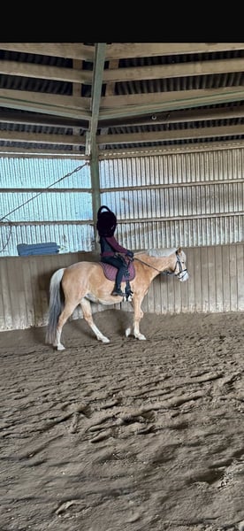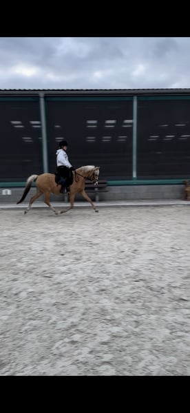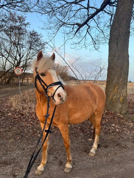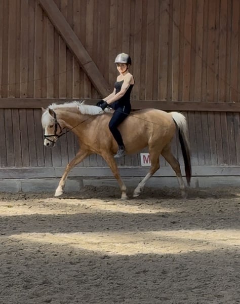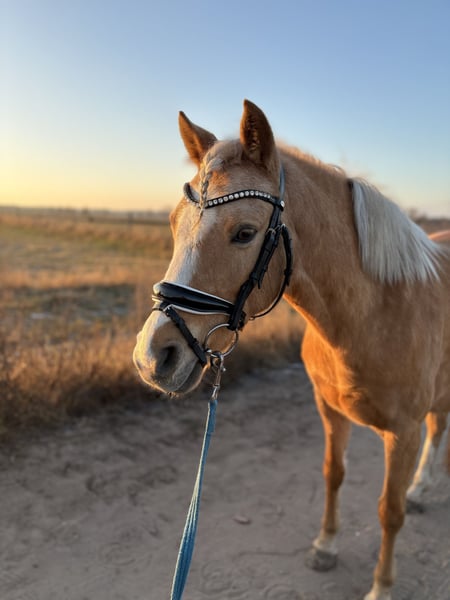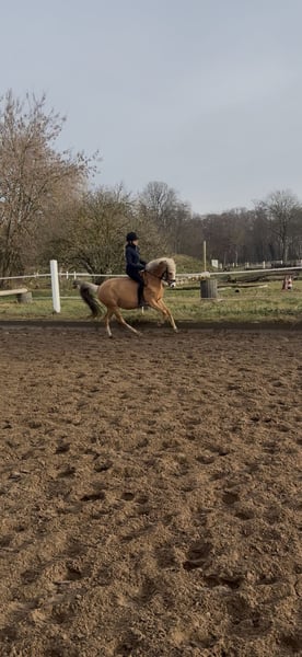 For private reasons, I am offering my German Riding Pony mare, born in 2017, Palomino, with a height of 14.0 hh. Bona is very easy to ride, responds well to gentle aids, and is generally quite sensitive. She is clear-minded and always easy to handle. She has a pleasant forward movement and can be ridden both bareback and with saddle, alone or in a group, in the field. She has also jumped small fences and enjoys it very much. Overall, she is always motivated and eager to learn. She is also well-behaved in handling. Bona has been ridden recreationally so far and has no competition experience. Although she appears sweet and well-behaved, she is not a children's pony and is not suitable for complete beginners or riding schools, as she is too sensitive. Last August, she unfortunately had a paddock accident in which three muscle layers on her belly and the extensor tendon on her hind left leg were torn. Her abdominal organs were not involved! Both injuries were successfully operated on, and she has no lasting issues and can be ridden normally. There are no restrictions regarding her feeding either. A veterinary report is available. Test rides and multiple meet-and-greets are definitely welcome. I might also consider offering her with a purchase option.