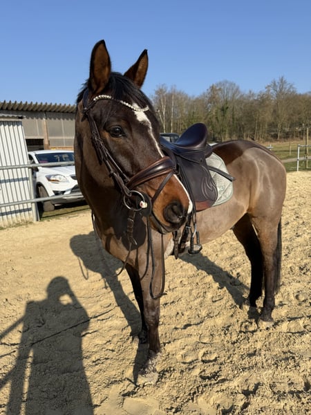 Brave 10-Year-Old Pony Gelding (Height approx. 1.52m) for Sale No Limit, affectionately called Norbert, has good basic gaits, is well-behaved in handling, people-oriented, and loves children. He is regularly ridden in the indoor arena, on the outdoor arena, and on trails. With me, he has mainly been trained with a focus on dressage and has already gained some competition experience in smaller WBO tests. There, he performed well and received scores in the 8 range. (Not suitable for someone with big competition ambitions at home.) He also enjoys jumping, although this has not been regularly promoted with me. Currently, he is shod with glue-on shoes, but he can also be transitioned back to barefoot; however, he will need hoof boots for trail riding. He spends the day in a gelding herd outside and sleeps in a paddock box at night. He is very compatible with others. Equipment can be taken over completely for an additional fee. X-rays from 2025 are available and can be viewed. Home before price. For further questions and interest, please feel free to call or contact via WhatsApp at 01604085276. To exclude riding tourism, I charge €30 for trial rides, which will of course be credited upon purchase.