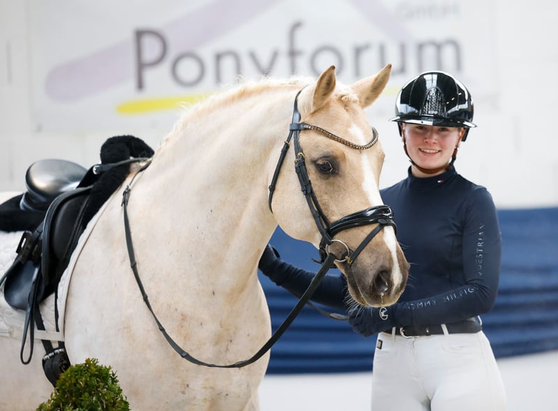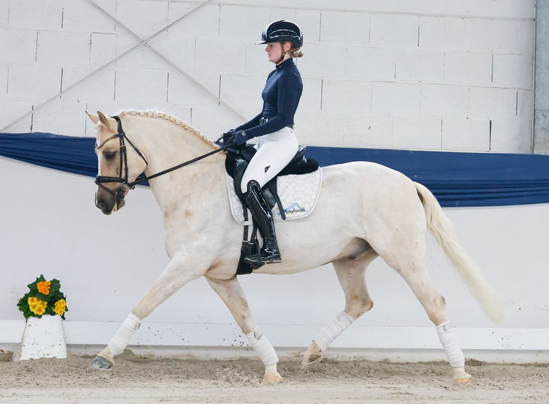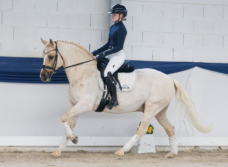 In unserer Kollektion stehen streng selektierte Reitponys f�r alle Anspr�che: Ausbildungs-, Zucht- und Kinderponys Hier gelangen Sie zur Gesamtkollektion: https://ponyforum.auction Platziert in Dressurprüfung Klasse L Siegreich und platziert in Dressurprüfungen Klasse A und E Platziert in Dressurprüfungen WBO Eddi – was für ein genialer Dressurprofessor! Dieser elfjährige Wallach hat nicht nur das Fell aus Gold, sondern ebenso sein Herz. Er ist super achtsam mit seinen Menschen – wir haben noch keine Situation mit ihm erlebt, in der er genervt die Ohren angelegt hat oä. Eddi ist super reell ausgebildet bis zum L-Level und reagiert auf die richtigen Hilfen immer mit der passenden Lektion. Er denkt für seinen Reiter mit und ist auch nicht zu empfindlich, wenn mal etwas nicht sofort klappt. Er konnte sich schon unter verschiedenen Reitern in Dressurprüfungen von WBO bis zur Klasse L im Turniersport platzieren. Auch im Außeneinsatz ist Eddi ein verlässlicher Partner, er ist sicher beim Anhängerfahren und im Turniersport. Abteilungsreiten ist auch kein Problem für ihn! Eddi deckt auch größere Reiter hervorragend ab und eignet sich daher sicherlich auch für einen kleinen erwachsenen Reiter, der ein zuverlässiges und gut ausgebildetes Dressurpony sucht.