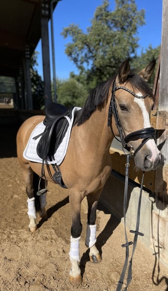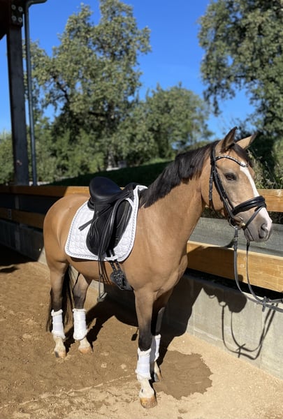 Zum Verkauf steht ein vielseitig veranlagter Reitponywallach mit drei sehr guten Grundgangarten. In der Dressur ist er bis Kl.L gefördert. Er macht aber auch einen guten Sprung und geht gerne mit anderen ins Gelände. Auf Turnieren fühlte er sich bisher nicht wohl. Deshalb wünschen wir uns für ihn einen ambitionierten Freizeitreiter, der ihn weiter abwechslungsreich fördern möchte. Da er ein liebenswerter Ponydickkopf sein kann, ist er kein Anfängerpony. Ein konsequenter Reiter wird mit ihm aber viel Spaß haben.