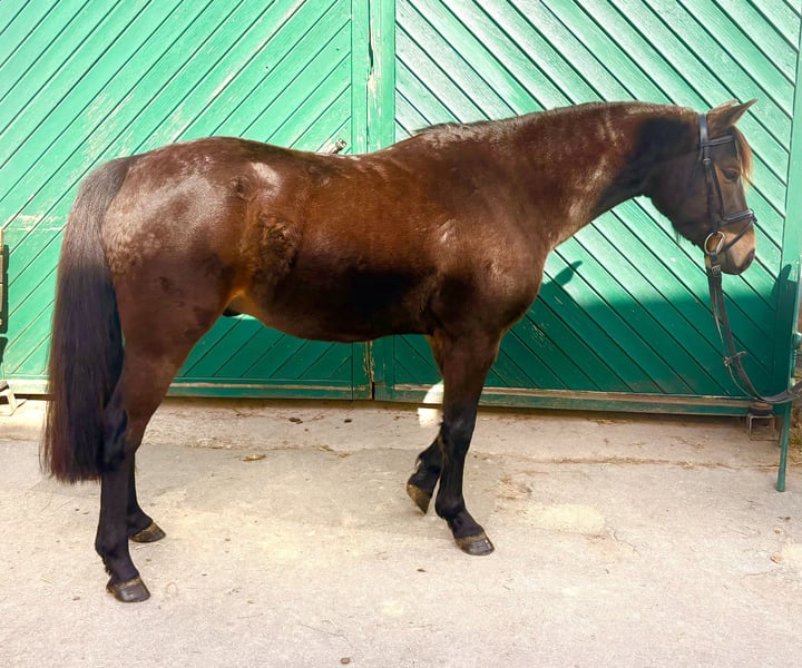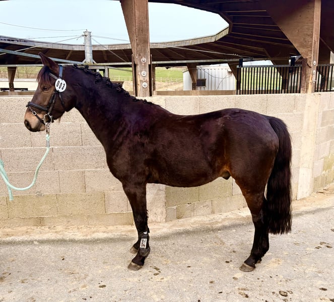 Zum Verkauf steht unser selbstgezogener, sehr typvoller, 4-jähriger Deutsches Reitpony Wallach mit einem aktuellen Stockmaß von ca. 1,35 m. Der Wallach überzeugt durch seine sehr gute Einstellung zur Arbeit, ist ausgesprochen brav im Umgang und zeigt sich unter dem Sattel unkompliziert und lernwillig. Er wird seit Anfang des Jahres behutsam angeritten und präsentiert sich dabei stets klar im Kopf und sehr kooperativ. Beim Freispringen zeigt er bereits jetzt viel Vermögen, Übersicht und eine sehr gute Technik. In einem Freispringwettbewerb belegte er kürzlich den 2. Platz und erhielt Noten von 8,2 für Vermögen und 8,4 für Technik. Neben seinem Talent am Sprung überzeugt er auch durch sehr gute Grundgangarten und eine ansprechende Bewegung, sodass er nicht nur im Springsport oder als Hunter geeignet ist, sondern vielseitig im Reitsport einsetzbar ist. Besonders hervorzuheben ist seine hochkarätige Abstammung. Er stammt ab von Quabar des Monceaux und aus einer leistungsstarken Mutterlinie über Dexter Leam Pondi, Corrado I und Diamant de Semilly. Die Mutterlinie ist sportlich sehr erfolgreich: Seine Großmutter Catness gewann 2021 die Deutschen Jugendmeisterschaften der Ponys (DJM) und platzierte sich außerdem unter den Top Ten der Pony-Europameisterschaften. Durch seine Einstellung, seine Qualität am Sprung, seine Bewegung und seine Abstammung ist er ein äußerst interessantes Nachwuchspony für den Kinder-Spring- bzw. Hunter-Sport, aber auch für andere Sparten des Reitsports. Bei ernsthaftem Interesse freuen wir uns über eine Nachricht. Wir wünschen uns für ihn einen Platz, an dem sein Talent erkannt und er entsprechend weiter ausgebildet und gefördert wird. Direkt vom Züchter.
