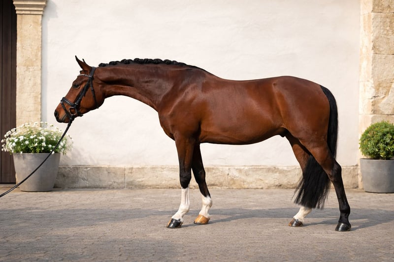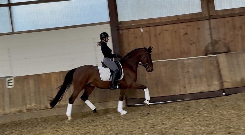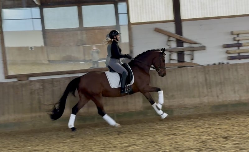 Zum Verkauf steht ein 4-jähriger Reitponywallach, abstammend von DSP Cosmo Royale x Londontime x Don Bosco, mit einem aktuellen Stockmaß von 150 cm (eingemessen Anfang des Jahres mit 148cm für 2026). „Royale“ wurde von uns selbst gezogen, wuchs behutsam auf, wurde im letzten Jahr schonend angeritten und befindet sich nun auf einem guten Weg in Richtung Dressurpferde A-Niveau. Er zeigt sich dabei lernwillig, ausgeglichen und mit einer angenehmen Arbeitseinstellung. Im Umgang ist er absolut unkompliziert, dementsprechend schmiede- und verladefromm, kennt Führmaschine, Paddock sowie Weide und ist sehr verträglich mit anderen Pferden. Aufgrund eines Befundes im TÜV wird er weit unter Wert abgegeben – ideal für jemanden, der ein talentiertes Nachwuchspony sucht und entsprechend fördern möchte. Bei Interesse freuen wir uns über eine Nachricht oder ein Telefonat. Gerne kann dann auch ein aktuelles Video zur Verfügung gestellt werden.