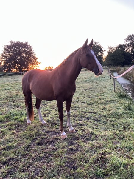 Zum Verkauf steht ein sehr lieber und motivierter 4-jähriger Wallach (ca. 1,51 m) von Cosmo Royale aus einer Black-Delight-Mutter. Er besticht durch seine außergewöhnlich auffällige Zeichnung: Fuchs mit breiter Blesse, vier weißen Beinen und einem großen weißen Fleck unterm Bauch – ein echter Hingucker. Seit August ist er schonend angeritten und wird zwei- bis dreimal pro Woche gearbeitet. Unter dem Sattel zeigt er sich super brav, ruhig und unkompliziert, lässt sich in allen drei Grundgangarten angenehm reiten und möchte seinem Reiter immer gefallen. Vom Typ her ist er ausgeglichen und sehr verschmust, macht im täglichen Umgang alles brav mit und zeigt sich auch beim Verladen sowie im Anhänger völlig problemlos. Durch seine Größe eignet er sich besonders gut für größere Jugendliche oder kleinere Erwachsene, die einen sicheren, freundlichen und gut auszubildenden Partner suchen. Ein absolut sympathischer junger Wallach, der durch sein tolles Wesen und seine besondere Optik täglich Freude bereitet und mit weiterer Förderung ein wunderbarer Begleiter für Freizeit, Ausbildung oder später auch den Sport werden kann.