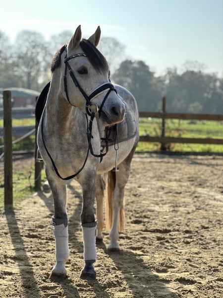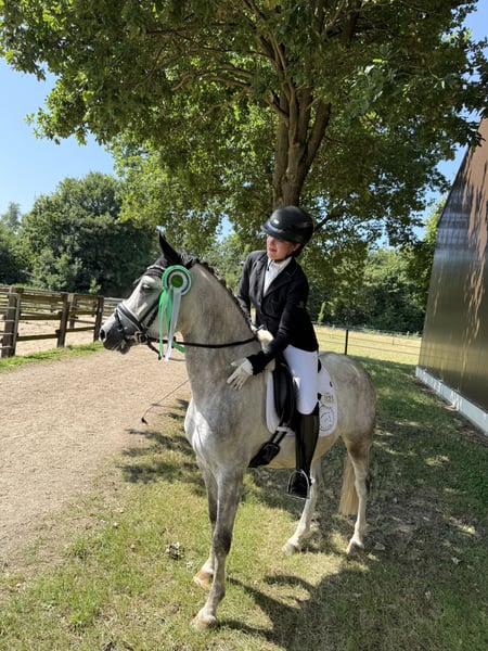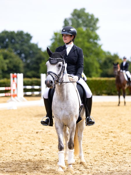 For sale is a 5-year-old grey pony gelding standing at 146 cm. A true charmer, he impresses with his wonderful temperament. He has multiple placements in A-Dressage tests (all results this season) and already shows promising signs of progressing towards L-Dressage. His gaits are solid and comfortable to sit, with his relaxedness and rideability making him an excellent partner for dressage. In handling, he is very gentle, uncomplicated, and farrier- and loading-friendly. Under saddle, he requires a confident rider who can give him trust – then he is always motivated, well-behaved, and reliable. With an insecure rider, he may become a bit cautious, but he always remains well-mannered. An ideal pony for ambitious riders who value an honest, easy-to-ride partner and enjoy learning together.