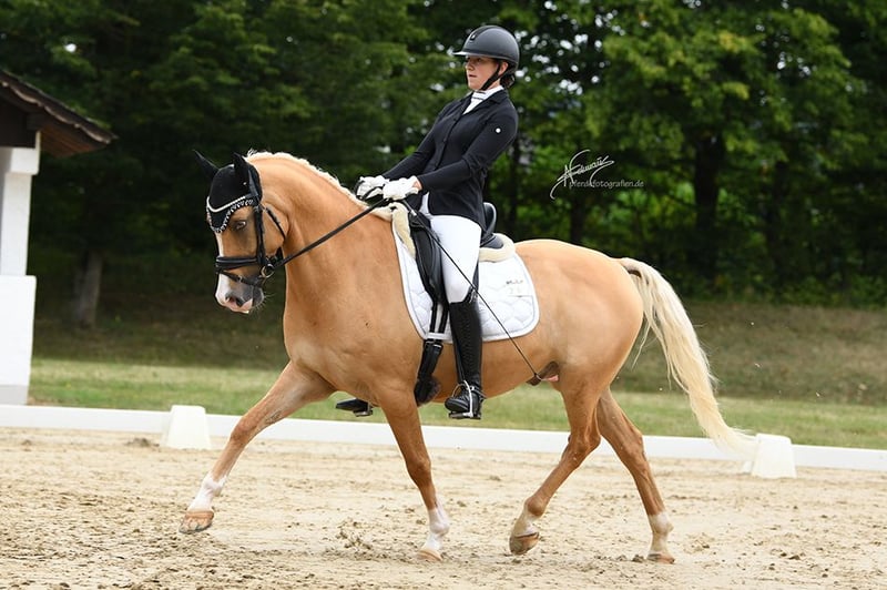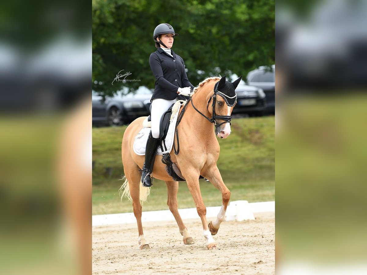 Absolut schweren Herzens suchen wir für unseren wunderschönen Pony Wallach ein neues Zuhause. Daily Gold lebt bei uns seitdem er 3 Jahre alt ist. Unsere Tochter war damals 12 Jahre alt und hat mit ihm die letzten Jahre vom Dressurreiter WB bis hin zur L** Dressur zahlreiche Siege und Platzierungen vorzuweisen. Im letzten Jahr sind die beiden ihre erste Pony FEI gestartet und waren direkt platziert! Auch kleinere Kinder trägt er brav durch Wettbewerbe. Mit seinen 8 Jahren ist er im besten Alter einem Kind den Weg in den Turniersport zu eröffnen und sich selbstverständlich auch noch weiter zu entwickeln. Daily kennt alles was ein Pony kennen sollte und ist für jeden Spaß zu haben! Da wir uns eingestehen müssen, dass unsere Tochter einfach zu groß für ihn ist und er noch viel zu jung ist, um nicht mehr geritten zu werden, suchen wir nun schweren Herzens ein tolles Zuhause für ihn. Als wir ihn gekauft haben war er vollständig ohne Befunde getüvt. Dieser TÜV liegt auch vor. Er war bei uns immer gesund. Er ist mit 148cm korrekt als Pony im Pass eingemessen. Ein passender Dresch Maß Sattel sowie das gesamte Zubehör können ebenfalls erworben werden.