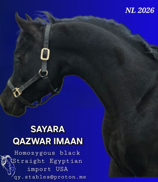 Straight Egyptian Arabian Warmblood, Imported from the USA, homozygous black, for breeding purposes. AVS NL registered. Qaz is a handsome young stallion with strong and correct conformation. He measures 155 cm and is just over 3 years old as of September 2025. Homozygous black rabicano. He inherited the luxurious mane of his grandsire, Sheik Imaan. He has a very stable temperament, very calm in his demeanor. Not nervous, no squealing. Good with younger horses, respectful towards mares. This year, his first foal will be born in the USA. The mare was pregnant after the first breeding attempt. Professional photos and videos will follow in spring. Qadir is also available; a straight Egyptian grey stallion, 150 cm, top-line. Breeding fee €1100. See other listing. Available for natural coverings. Fresh semen at K.I. station also possible. Travel arrangements with the stallion(s) can be made upon request (NL, DE, BE, Austria, Switzerland, Slovenia, Croatia). Costs for fresh semen K.I. or travel to the mare/stallion (with foal) are additional and are the responsibility of the mare owner. Transportation of the mare to QY can also be arranged for a reasonable fee. Foal guarantee: if a colt is born, you will receive the next breeding at half price. Live foal guarantee. **Apart from the covers covered by the guarantee, no repeats of matings will be made. This ensures your foal has an exclusive pedigree.** Serious, neat inquiries will receive a serious, professional response. Please preferably contact via WhatsApp +31 610 271771. Anonymous or random questions here will not be answered. Your first name and phone number are appreciated.