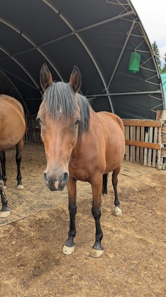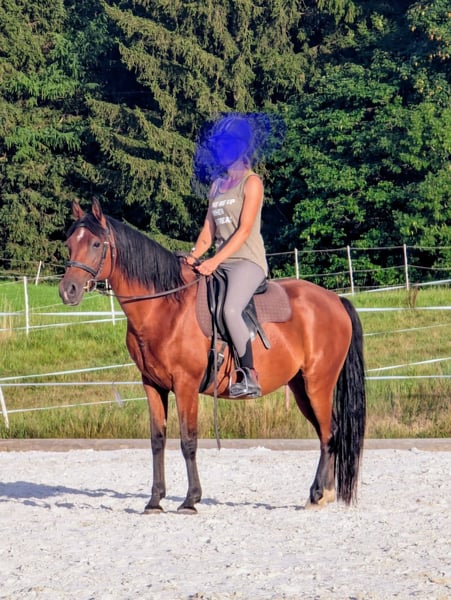 We took him over last year after his horse companion unfortunately passed away. He was kept in a paddock for a long time and now needs groundwork and trust-building. We've already achieved a lot with him, but he is not suitable for beginners. I have also ridden him in the arena before; he was well-behaved and tended to stand rather than rush forward. Unfortunately, due to health reasons, I simply don't have the time to work with him regularly. He has been ridden both English and Western. He is currently kept in a pasture with a mixed herd. He is regularly vaccinated and dewormed. We are including his English saddle with the horse. If someone is not looking for an immediate riding horse but is willing to give him the time to develop a bond, he will surely make a good partner.