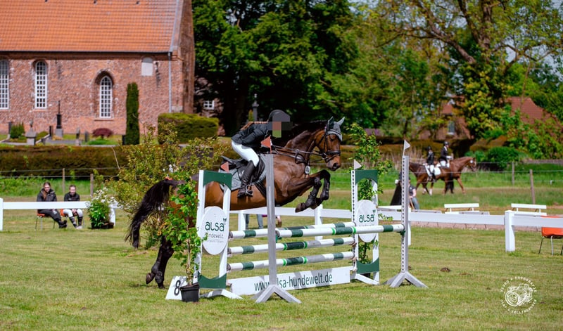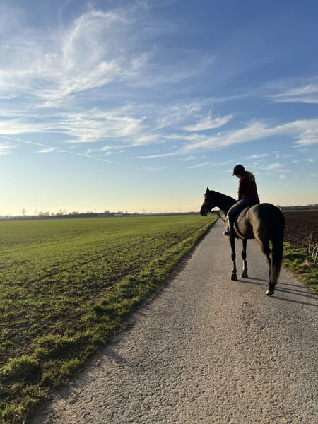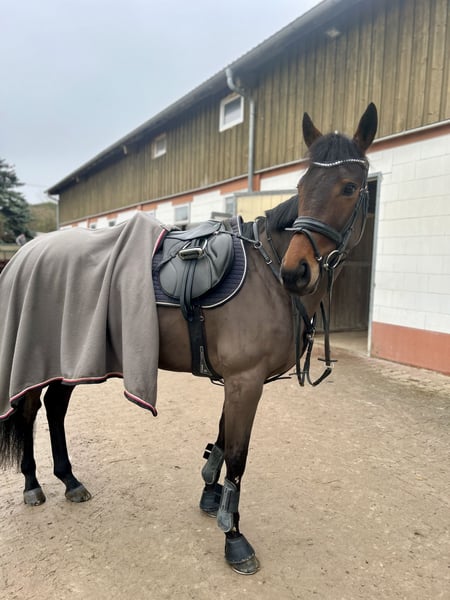 For sale is my 9-year-old Thoroughbred mare with an approximate height of 16.1 hh. Bailey competes in both leisure riding and show jumping, having placed up to A** level and won at A*. She consistently demonstrates great motivation and a strong desire to jump. She actively approaches the fences and clears every obstacle with enthusiasm. She easily handles trail riding, as well as indoor and outdoor arenas. At competitions, she remains consistently relaxed and confident. In handling, Bailey is an absolute dream mare: very gentle, people-oriented, uncomplicated, and affectionate. She is familiar with children, dogs, farm vehicles, and cats, and always remains calm and composed. Due to her temperament and her eagerness to work, she requires a confident, calm rider who can provide security, as she can become nervous quickly. With a trusting owner who gives her confidence, she develops into a reliable partner you can count on through thick and thin. She is shod in front, with currently barefoot hind feet (she has been shod behind in the past for competition purposes). She is in good health. A health check (AKU) is not available but can, of course, be arranged by the buyer. Bailey is only available to a loving, experienced home and will only be sold if the fit is perfect. She is looking for a forever home with plenty of attention and time. Location: Heidelberg Please feel free to contact me with any questions. WhatsApp preferred: 015142106262