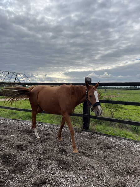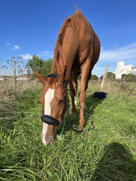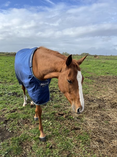 Currently available for sale, a 4-year-old (born in 2021) chestnut Thoroughbred mare. She stands approximately 1.60 meters (16.1 hh). She has never raced or undergone intensive training, so she is not "overworked" by early work. She is in the final stages of breaking, has already been ridden multiple times at walk and trot, and is okay with mounting. She is therefore ideal for a rider looking for a horse that can be handled easily 😉 She is not particular about outdoor conditions and would make an excellent leisure, hacking, or competition horse. Good jumping bloodlines (Linamix and Gemix)! She is up to date on all veterinary care: dental, farrier (barefoot), osteopath, and vaccinations. She lives outdoors 24/7 with other horses, fed solely on grass and hay ad libitum. Feel free to contact me for more photos and videos 😊