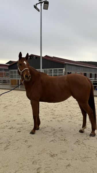 Nasza klacz Käthe szuka nowego domu. Była u nas wykorzystywana podczas lekcji jazdy konnej oraz w początkowych etapach nauki skoków przez przeszkody i wykazuje się niezawodnym zachowaniem. Käthe miała uraz ścięgna podeszwy, który wymagał okresu odpoczynku w boksie. Obecnie jest lekko kulawa i nie jest jeszcze w pełni wytrenowana, dlatego jej jazda jest ograniczona. Jednakże doskonale nadaje się jako klacz towarzysząca lub do hodowli. Obecnie mieszka w wolnym wybiegu w majej grupie klaczy, ale zna również stajnię z możliwością wypasu na pastwisku i paddocku.