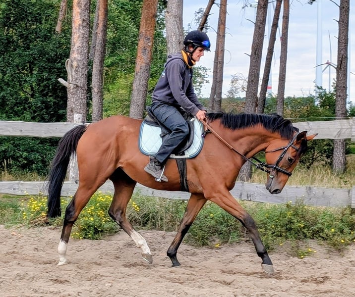 Lexi is a 166 cm tall, sturdy, and beautiful Thoroughbred gelding. At six years old, he brings a lot of experience and calmness, and he is very fearless. In dressage work, he tends to be a bit more relaxed. He loves going out on trails and is well-behaved both alone and in groups. He is blacksmith and loading friendly, vaccinated, microchipped, and dewormed. Lexi is herd-compatible and gets along well with both mares and geldings. A nice, affectionate, and friendly, open-minded big gelding. For more information, feel free to contact via WhatsApp or phone: 01633276779 If seriously interested, the gelding can be met and tried out at any time. www.pferdestaerke-aktiv.de