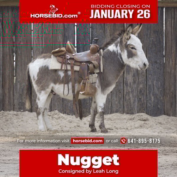 𝐉𝐀𝐍𝐔𝐀𝐑𝐘 ⭐️𝑨𝒍𝒍 𝑺𝒕𝒂𝒓 𝑳𝒊𝒏𝒆𝒖𝒑⭐️ Happening now thru MONDAY | JANUARY 26th - Available EXCLUSIVELY on HorseBid's website! For more details and to register visit: www.Horsebid.com CONSIGNOR CONTACT: Leah Long 641-895-8175 LOCATION: Sulphur Springs, TX BREED: Mini donkey REGISTERED: No COLOR: Paint HEIGHT: 41 inches AGE: 3 GENDER: Jack Nugget is a 3 year old Jack that stands 41 inches tall and is hands-down one of the friendliest donkeys you will ever meet. This little guy doesn’t wait to be caught he meets you at the gate, follows you around the farm like a puppy, and soaks up attention, especially from kids. Nugget is the kind that makes everyone smile the moment they meet him. He puts his head right in the halter, is easy to catch, groom, saddle, and bathe, and stands great for the farrier. Nugget rides and has been ridden by kids around the farm, making him a fun and safe little partner for farm adventures. One of his coolest party tricks? Nugget is trained to lay down and does it politely and willingly no drama, just good manners. Fair warning: you will hear him every morning when you wake up. Nugget likes to announce that a new day has started and he’s ready to be part of it. He’s full of personality, charm, and character, and truly loves being involved. Nugget would make a fantastic addition to ANYONE’S farm whether you’re looking for a family-friendly donkey, a kid-safe companion, or just a lovable barn favorite. This is a special little donkey that’s hard not to fall in love with. 💛