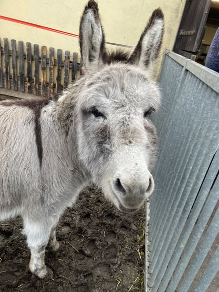 Pferdinand ist ein relativ kleiner Esel Hengst mit einem Stockmaß von ca. 1 Meter und ist am 05.10.2022 in unserem Tiergehege geboren. Das bedeutet er kennt den Umgang mit anderen Artgenossen sowie alltägliche Einflüsse wie täglichen Kontakt mit verschiedenen Personen, Kinder am Zaun, er lässt sich anfassen und putzen und kennt auch schon den Tierarzt. Da es in unserer Eselherde bereits einen Leithengst gibt, musste er eine Zeit lang getrennt stehen, um Auseinandersetzungen, Verletzungen oder Schlimmeres zu vermeiden. Diese Entscheidung fiel uns nicht leicht, war aber zu seinem Schutz notwendig. Durch die zeitweise Einzelhaltung ist er aktuell sehr aufmerksam und manchmal etwas überdreht, wenn Besuch kommt. Er freut sich über jede Form von Aufmerksamkeit und überschätzt sich dabei gelegentlich selbst. Mit klarer, ruhiger Führung und konsequenter Haltung wird er sich jedoch weiter gut entwickeln. Er sucht ein Zuhause bei erfahrenen Eselhaltern, die ihm Sicherheit, Geduld und artgerechten Kontakt zu passenden Artgenossen bieten können. Mit der richtigen Führung wird er sich zu einem tollen, charakterstarken Begleiter entwickeln. Bei ernsthaftem Interesse freuen wir uns über eine Nachricht und erzählen gerne mehr über ihn! Preis verhandelbar!